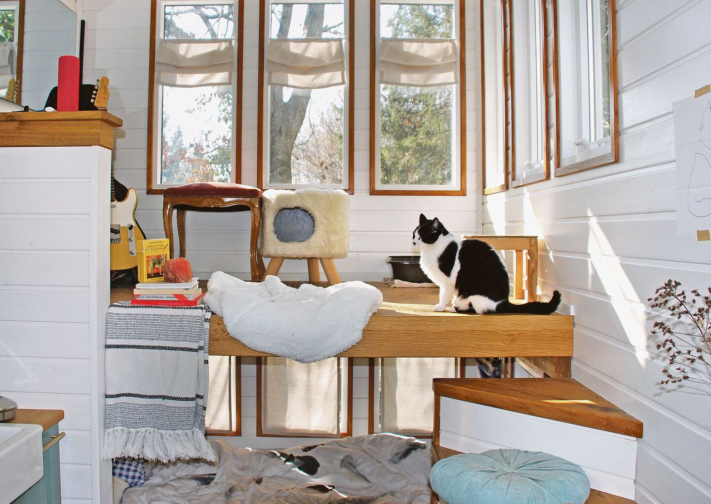 Dass es mit ihrem lichtdurchfluteten Tiny House, das über 21 Fenster verfügt, in bester Lage geklappt hat, liegt einerseits am Entgegenkommen der Gemeinde Affeltrangen und andererseits an Bernhard Lüthi, auf dessen Grundstück sich das Häuschen samt grosszügiger Terrasse befindet. «Er hat von der Tiny-House-Vermittlung der Hubers gehört und bot einen Platz an. Es waren also sehr glückliche Umstände, als ich auf Conny und Sandro Huber wegen eines Tiny Houses zugegangen bin und diesen tollen Standort bekommen habe», erzählt Marina Niedermann, während ihr eine ihrer Katzen schnurrend um die Beine streicht.