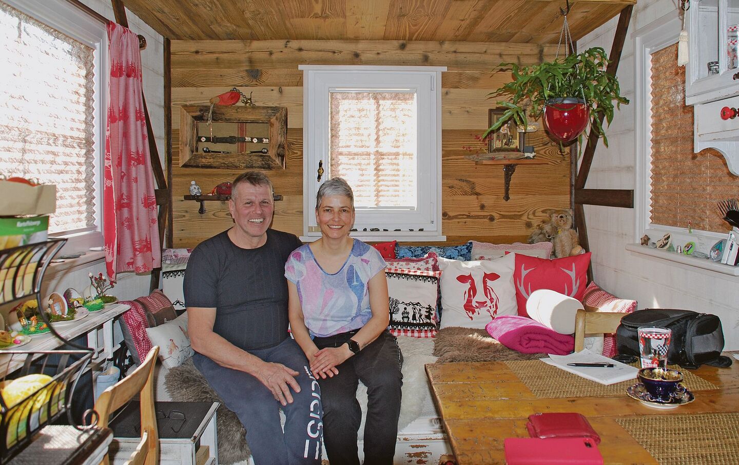 Dazu komme noch die ökologische Komponente. «Ein Tiny House spart nicht nur Ressourcen, es versiegelt auch niemals den Boden», betont der ehemalige Hühnerzüchter Sandro Huber. Das sei enorm wichtig. Nachteile fallen ihm spontan keine ein. Man müsse sich einfach sehr gern haben, wenn man so eng zusammen haust, sagt er und lacht herzhaft. Conny Huber schmunzelt ebenfalls, fügt aber schnell an, dass das doch bei jeder Form des Zusammenlebens die Grundvoraussetzung sei. Abgesehen davon ist es trotz der beengten Verhältnisse möglich, Gäste zu empfangen. Nicht nur draussen in der lauschigen Laube, sondern auch drinnen. «Wir haben schon mit zehn Leuten einen Geburtstag bei uns gefeiert. Das war sehr spassig. Einige wollten gar nicht mehr gehen», erinnert sich Conny Huber und wirkt dabei sehr glücklich.
