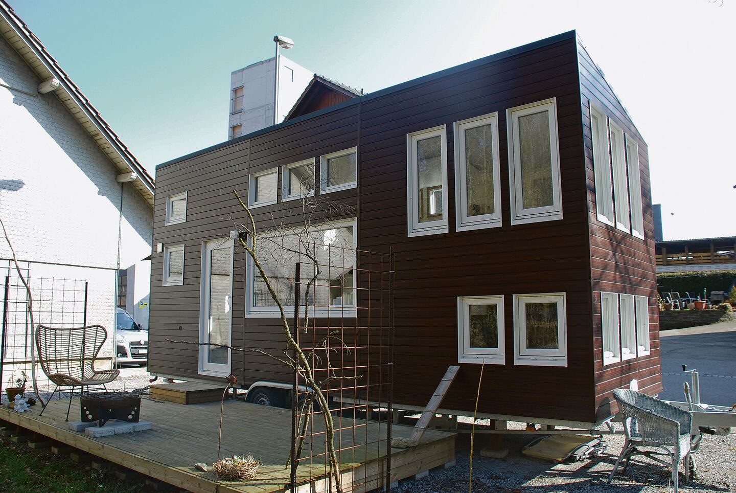 Von Weitem fällt das Zuhause von Conny und Sandro Huber im thurgauischen Affeltrangen kaum auf. Ihr rollendes Tiny House (auf Deutsch: winziges Haus) steht nämlich unmittelbar vor einem grossen Gebäude und fügt sich perfekt in die Umgebung ein, fast wie ein Vorbau. Steht man aber unmittelbar vor dem Häuschen des Paares, dem kleinsten des Kantons, ist es mit seinem dazugehörigen begrünten, überdachten Gartensitzplatz ein wahrer Blickfang. Die braune Verkleidung in edler Holzoptik, die weissen Fenster und die moderne, teilverglaste Eingangstür machen es zu einem Schmuckstück, das die Neugier weckt, mehr zu sehen. «Kein Problem», findet Sandro Huber und lässt seinen Besuch eintreten. Als Erstes fällt die hochwertige, vollausgestattete Küche mit dem Gasherd, dem rot-goldenen Ofen und der passenden stylischen Designer-Dunstabzugshaube ins Auge. Rechts daneben befindet sich ein kleines Bad mit WC und Dusche, links eine Sitzecke mit Tisch, Stühlen und Sofa. In diesem Moment kommt Conny Huber eine schmale Treppe herunter. Diese führt zum vier Quadratmeter kleinen Schlafbereich direkt unter dem Dach. Dazu kommen 19 Quadratmeter ebenerdige Wohnfläche.