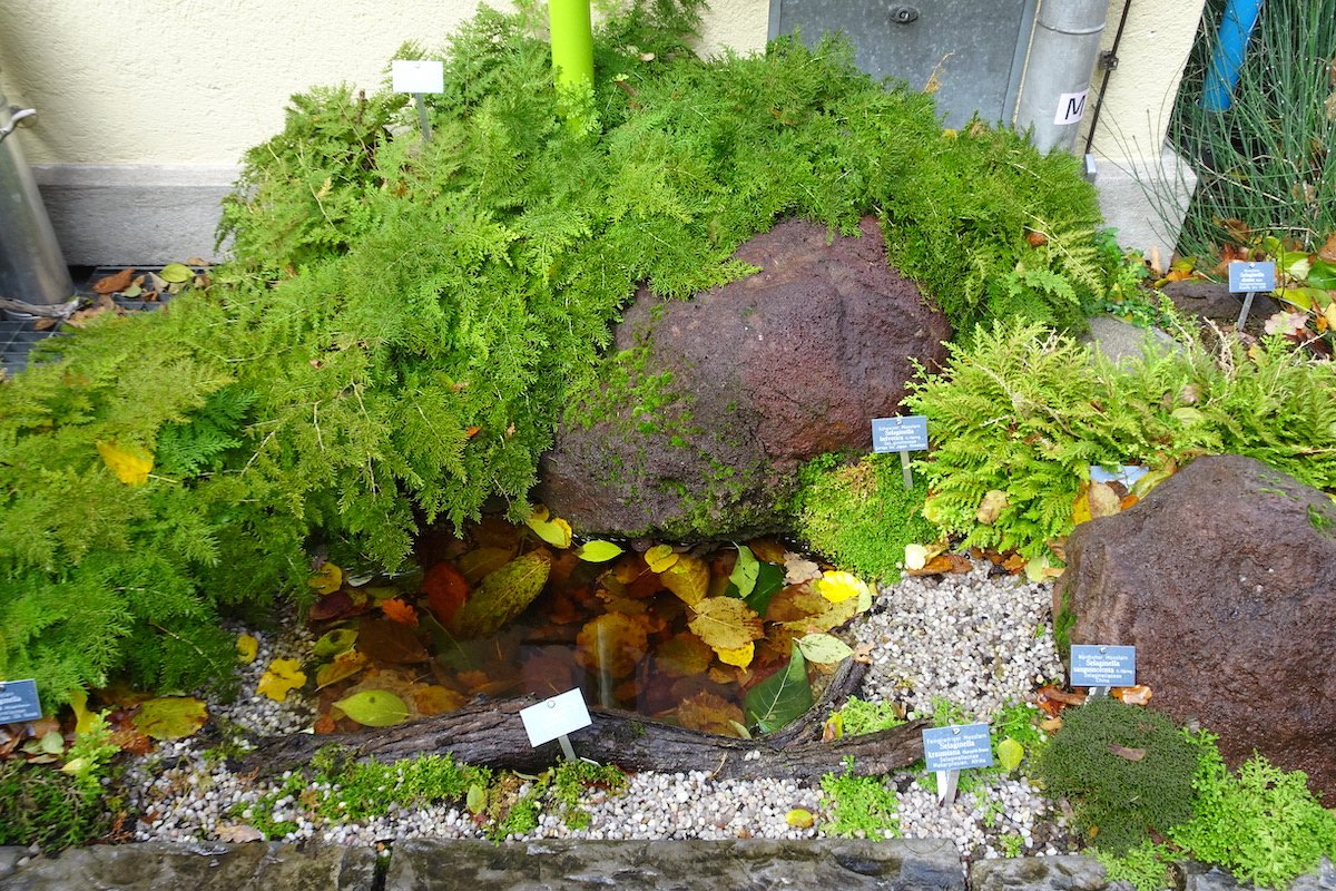 Im Hof des Botanischen Gartens Bern wurden entlang der Gebäude entsprechende Kleinlebensräume angelegt. Sie zeigen die Entwicklungsgeschichte der Pflanzen, angefangen von Wasserpflanzen in kleinen Teichen über Moose, die auf Lavasteinen gedeihen bis zu Farnen und Bärlappgewächsen. «Bärlappgewächse waren die ersten Pflanzen, die echte Leitsysteme hatten», sagt die Botanikerin. Fossile Bärlappgewächse werden seit rund 420 Millionen Jahren nachgewiesen. Zu den Bärlappgewächsen gehören auch die Schachtelhalme, die an feuchten Stellen wachsen. Es sind also richtige Urzeitpflanzen, die schon da waren, als Dinosaurier herumstreiften. Damals gab es gar baumförmige Bärlapppflanzen, deren Wälder die Nordhalbkugel dominierten. «Die baumförmigen Vertreter der Bärlappgewächse sind alle ausgestorben, die krautigen aber haben sich bis in die heutige Zeit gut gehalten», sagt Katja Rembold. Der Name Schachtelhalm stamme daher, weil die Pflanzen ineinander verschachtelte Elemente aufwiesen.