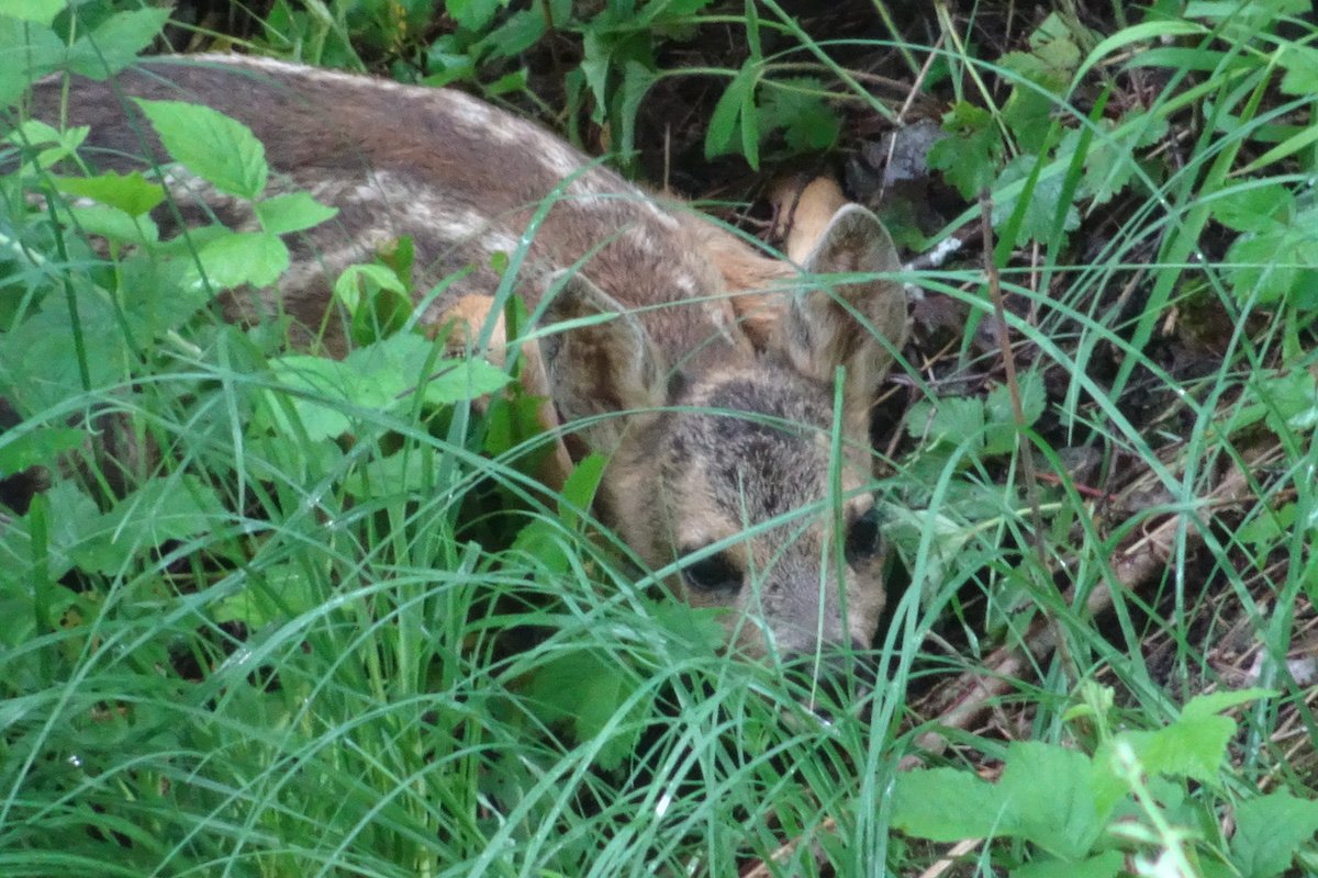 Knacken im Gebüsch. Ein Reh verschwindet im Dickicht. Doch da duckt sich noch etwas Braunes ins hohe Gras der Lichtung. Das Kitz bleibt zurück und vertraut auf seine Tarnung wenig unterhalb des Wegs im Baltschiedertal entlang der Suone Gorperi im Wallis.