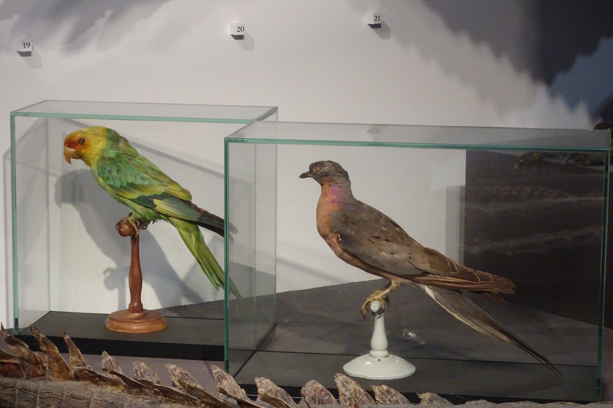 Der Vielfalt an Tropentieren ist ein anderer, kleinerer Ausstellungsbereich gewidmet. Dort ist ein seltenes Exemplar des Spix-Aras ausgestellt. Diese Art wurde erst 2023 aus Volierenbeständen wieder in ihre brasilianische Heimat ausgewildert. Sie galt bisher als ausgestorben. Nicht wieder zum Leben erweckt werden, können die Wandertaube und der Karolinasittich. Die beiden Arten der USA kamen einst in den Südstaaten in grosser Anzahl vor, wurden aber hauptsächlich schon im 19. Jahrhundert von Siedlern ausgerottet. Die Wandertaube unternahm in riesigen Schwärmen, die wie Wolken wirkten, grosse Züge bis in nördliche Bundesstaaten. Auf alten Illustrationen sind diese Taubenwolken eindrücklich dargestellt.