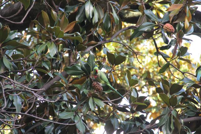 Die gesamte Gartengestaltung vereint den maurischen, italienischen und englischen Gartenstil und spiegelt den Wunsch nach Schatten und Duft. Palmen, Zypressen, Myrten, Orangen und Zitronenbäume schaffen Struktur, Rosen und Jasmin bilden Farbtupfer und Düfte. Geheimnisvoll bläulich leuchten die Blüten des Jacaranda-Baums in verschiedenen Ecken. Die ledrigen Blätter von Magnolien bieten Kontrast. Nestelt da nicht ein grüner, länglicher Vogel an einer Magnolienblüte? Tatsächlich, ein Kleiner Halsbandsittich tut sich daran gütlich. Diese Asiaten sind in vielen europäischen Städten heimisch geworden.