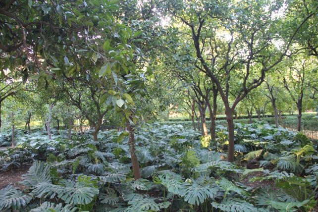 Im Damengarten schweift der Blick von einer steinernen Galerie durch Torbögen hindurch über formale Buchshecken und einst in raffinierter Anordnung gepflanzte Palmen mit vielen Meter langen, schmalen, grazilen Stämmen mit ausschweifenden Kronen, die wie ein Kopfputz eines Indianerhäuptlings wirken. Euphorbien-Gewächse sorgen mit ihrem verzweigten Wuchs für wohltuende Unterbrechungen des formalen Gartenstils. Es würde nicht erstaunen, wenn eine Prinzessin aus längst vergangener Zeit mit verträumtem Blick dort unten wandeln würde.