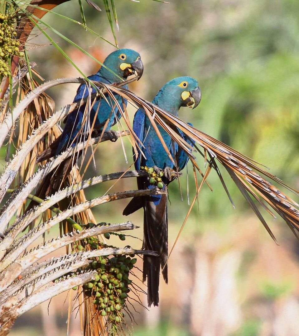 Anderntags führt er durch einen schmalen Gang aus Schilf, der in ein grösseres Versteck aus Zweigen und Brettern mündet. Im diesigen Licht der Schilfhütte hört man von ausserhalb Knacklaute sowie kurze, heisere Schreie. Beim Blick durch die Scharte verschlägt es einem die Sprache. Gut 50 Hyazinth-Aras knacken Nüsse. Lima und seine Kollegen haben sie vorgängig ausgelegt. Die Hyazinth-Aras als grösste aller Papageien sind spektakulär. Sie sind nicht die einzigen Grosspapageien im Gebiet. Aus einer Krone einer Buriti-Palme fliegt ein Paar Dunkelrote Aras krächzend davon. Auch sie brüten in Felshöhlen.