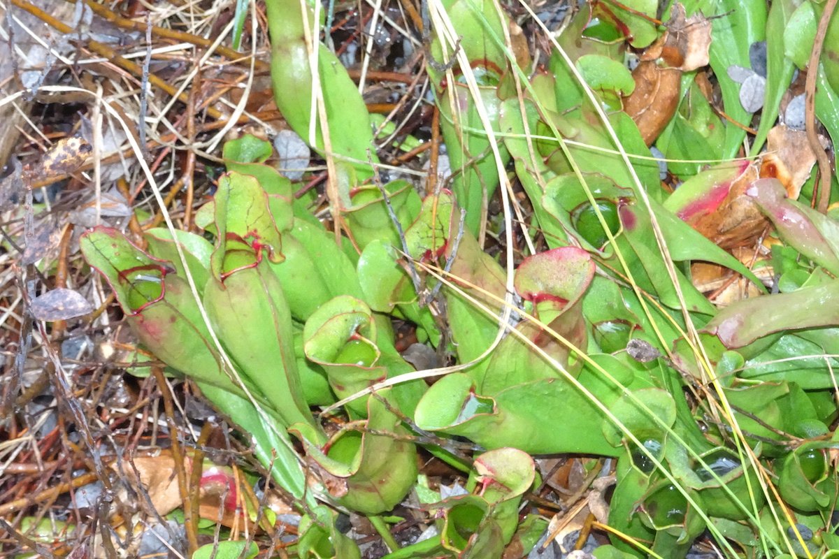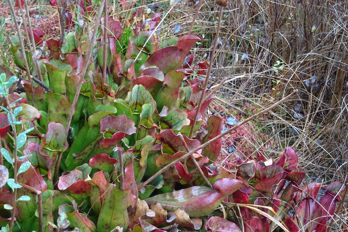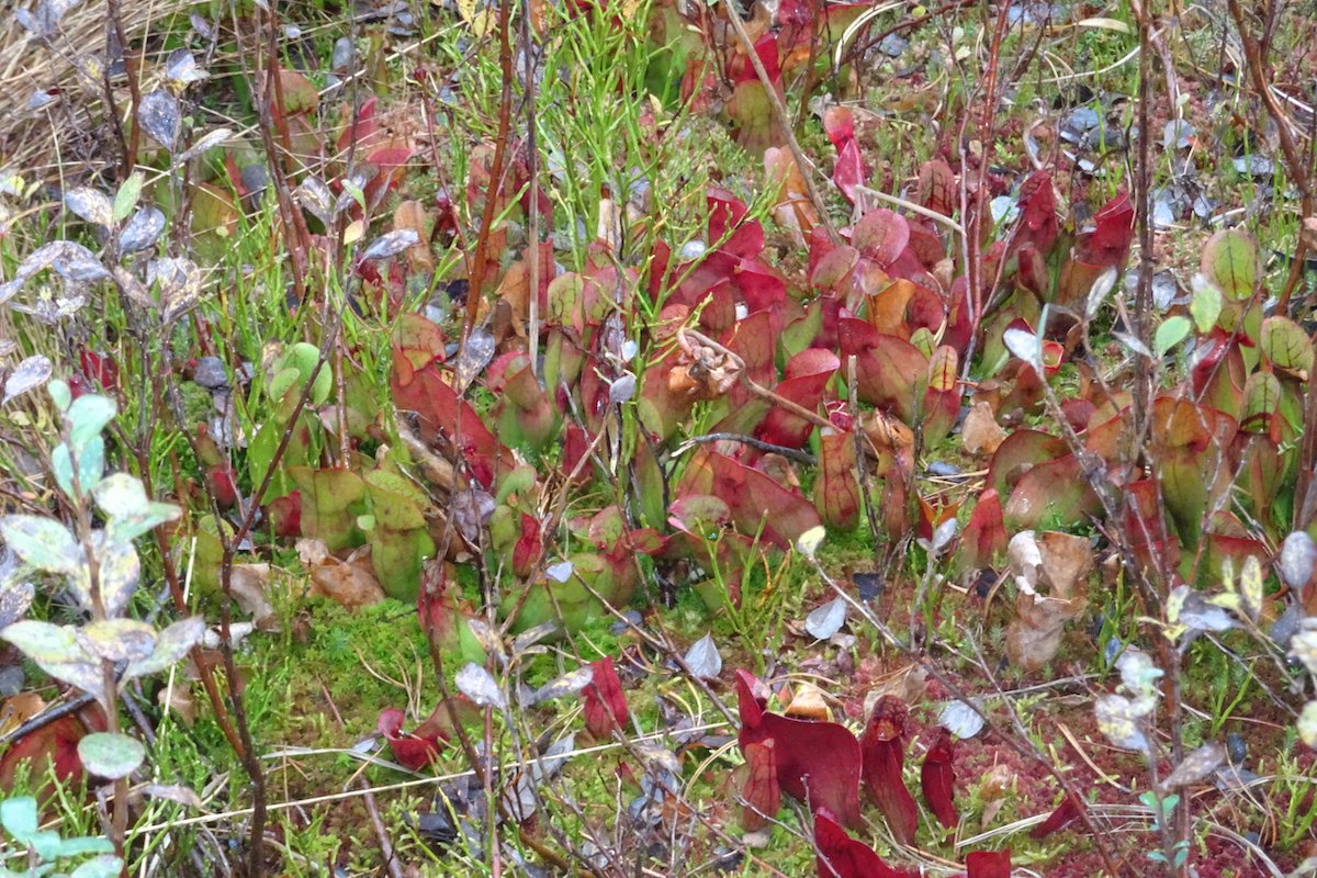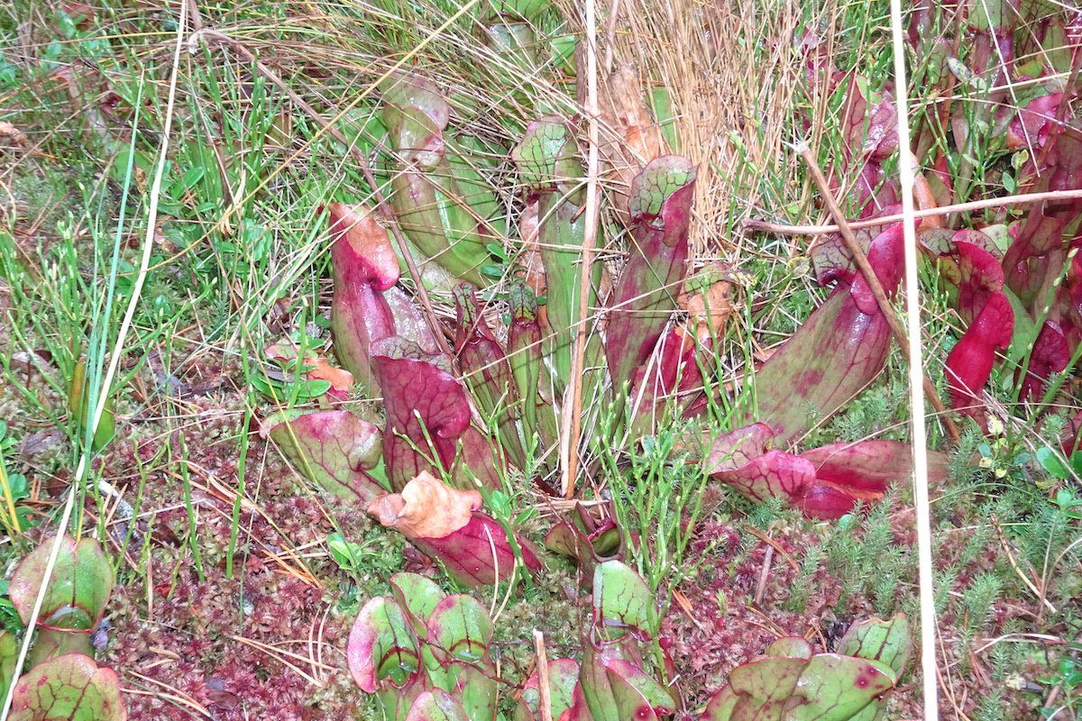 Die nordamerikanische Krugpflanze wird auch Rote Schlauchpflanze genannt, denn die krugbildenden Blätter sind in gewissen Entwicklungsstadien rot gefärbt. Eine Infotafel im Gebiet verweist darauf, dass die Art bereits 1919 hier ausgewildert wurde. Es sei heute verboten, gebietsfremde Pflanzen anzusiedeln. Die Krugpflanze bilde aber kein Problem, da sie nicht invasiv sei, sich also nicht auf Kosten anderer Arten ausbreite, steht da weiter.