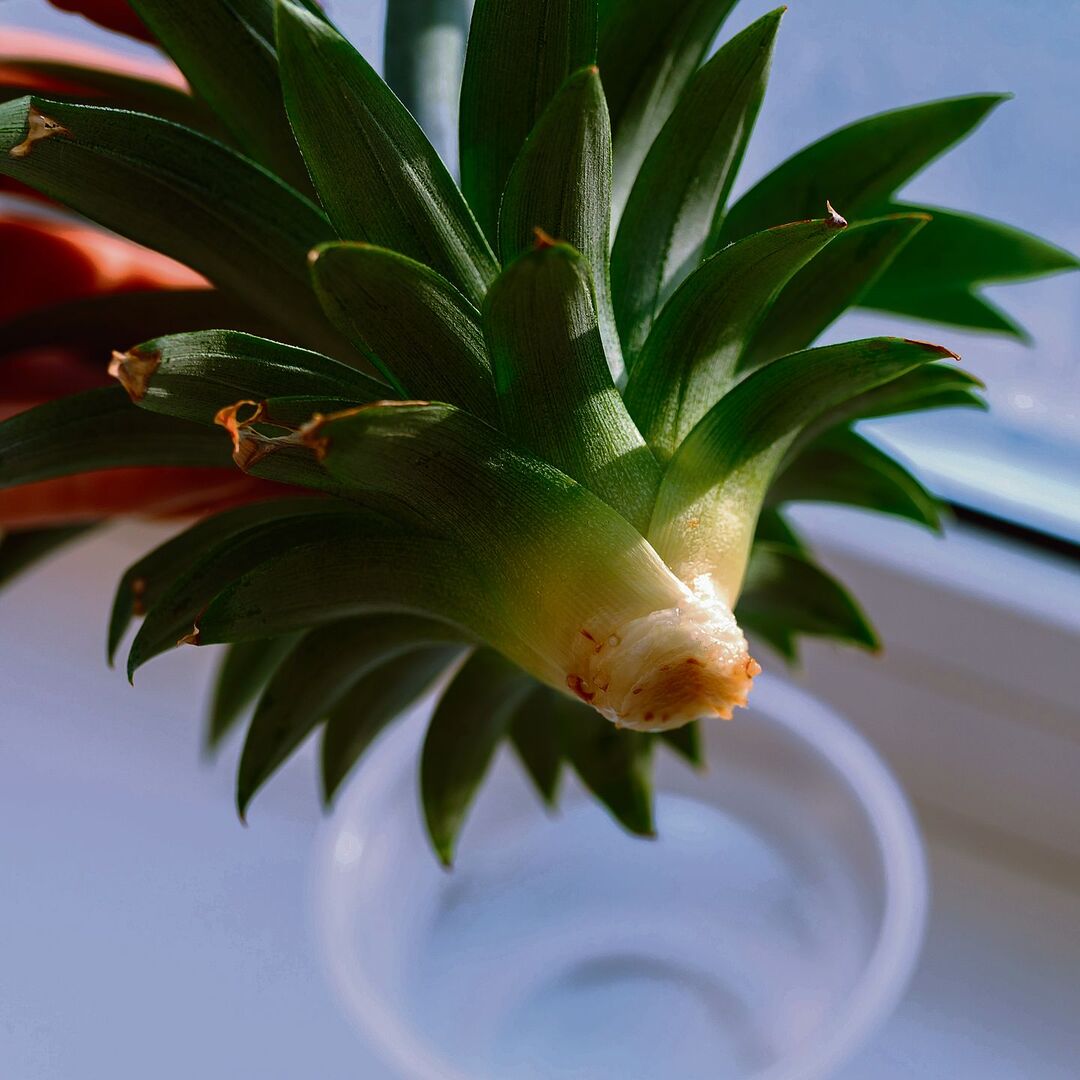 Eine Ananas mit der Regrowing-Methode nachwachsen zu lassen, erfordert etwas gärtnerisches Geschick und Geduld, ist aber eigentlich gar nicht so schwierig, wie es aussieht. Um eine Ananas aus einem Strunk zu ziehen, braucht es zuerst einmal die «ideale» Frucht. Sprich, eine mittelreife Ananas, deren Fruchtfleisch schön gelb ist, aber nicht matschig sein darf. Zudem sollten die Blätter grün und gesund sein. Hat man eine solche Ananas zur Hand, muss zuerst der Strunk gelöst werden. Dafür die Frucht gut festhalten und den oberen Teil mit den Blättern vorsichtig nach links und rechts drehen, bis er sich löst. Danach alte Blätter entfernen, dabei etwa zehn Blätter stehen lassen. Ganz wichtig ist es jedoch, dass der Strunk inklusive Blattschopf intakt bleibt, da sich sonst keine gesunden Wurzeln für die neue Pflanze bilden können.