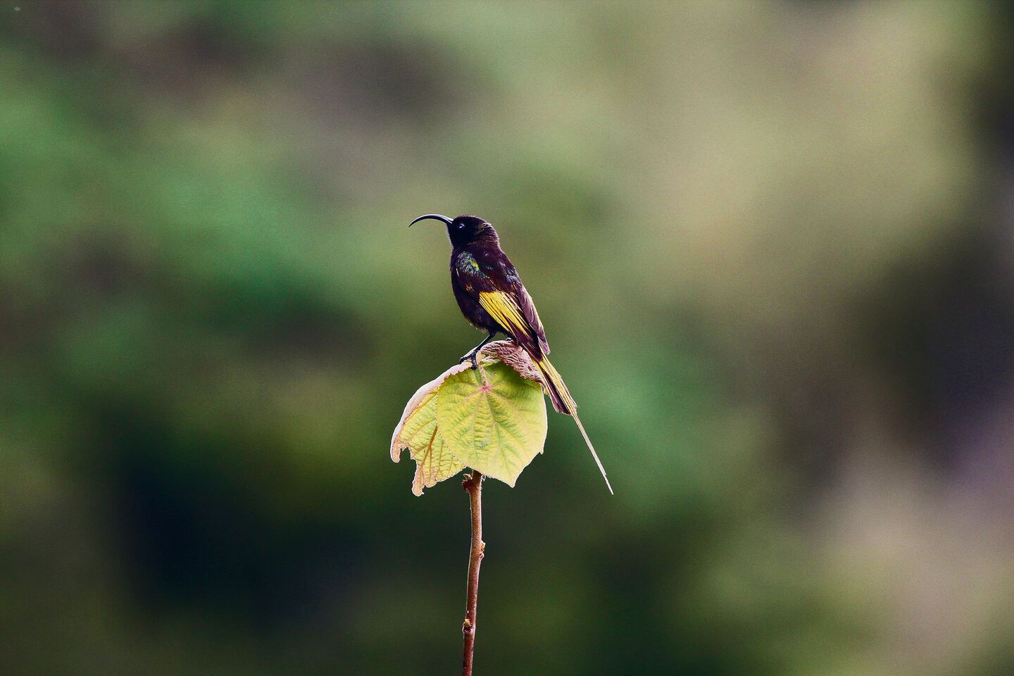 Die Sonne hatte nur ein kurzes Intermezzo, was die winzigen gelblichen Vögelchen mit weissen Augenringen nicht kümmert. Sie suchen weiter nach Blattläusen, während der Goldschwingen-Nektarvogel unermüdlich Blüten besucht. Nektarvögel in Afrika sind die Pendants der Kolibris Südamerikas.
