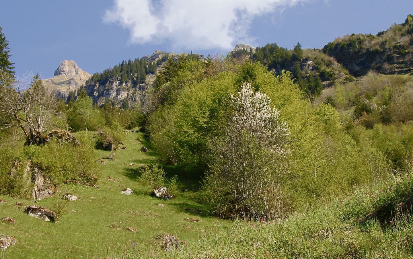 Der Frühling beginnt gerade erst auf über 1000 Meter über dem Meeresspiegel. Die Blätter an Erlen, Weiden und Ebereschen spriessen hellgrün, ein Kuckuck ruft, die Weidenmeise flötet. Die Bäume gedeihen inselartig. Dazwischen spriessen verschiedene Gräser. Blumen, wie die Salbei, Nelkenarten, Esparsetten, Knautien, Margeriten, Flockenblumen, Horn- und Hufeisenklee sowie Natternköpfe blühen; eine Orgie an Farben. Die Weiden sind von Felsen durchsetzt, in einem Taleinschnitt gedeiht dunkler Tannenwald. «An diesem Hang hier kommt mehr als die Hälfe aller Schweizer Tagfalterarten vor», sagt Hans-PeterWymann. Ideales Schmetterlingsgebiet also.