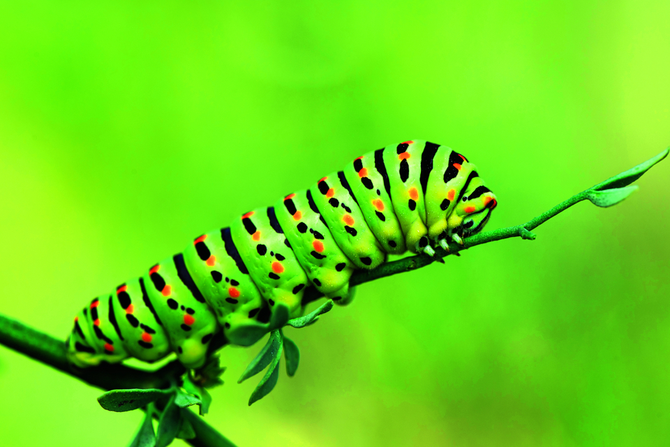 Wer Schmetterlinge liebt, muss Raupen mögenDer Schmetterling ist ein Verwandlungskünstler. Er zeigt sich als farbig gaukelnder Falter und Blütenbesucher. Doch bevor er dieses Stadium erreichen kann, braucht es das Ei. Daraus schlüpft eine Raupe, die sich satt frisst und verpuppt. Die Metamorphose verläuft also in vier Stufen. Der Schmetterling ist die mobilste Phase der Entwicklung. Darum fallen Paarung und Eiablage in diese Zeit. Wer die Metamorphose aus nächster Nähe erleben möchte, sammelt beispielsweise an Brennnesseln Raupen. Es handelt sich um die Raupen des Kleinen Fuchses. Sie müssen stetig mit frischen Brennnesseln gefüttert werden und sollten in einem mit Vorhangstoff überzogenen Plastikaquarium herangezogen werden. Haben sie sich verpuppt, bleiben die Stängel mit den Puppen im Behälter. Bei sommerlicher Wärme schlüpfen nach etwa zwei Wochen bereits Schmetterlinge. Sie sollten dort freigelassen werden, wo die Raupen gesammelt wurden. In Naturschutzgebieten ist das Sammeln von Raupen und Pflanzen verboten.