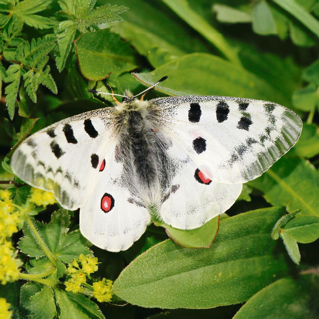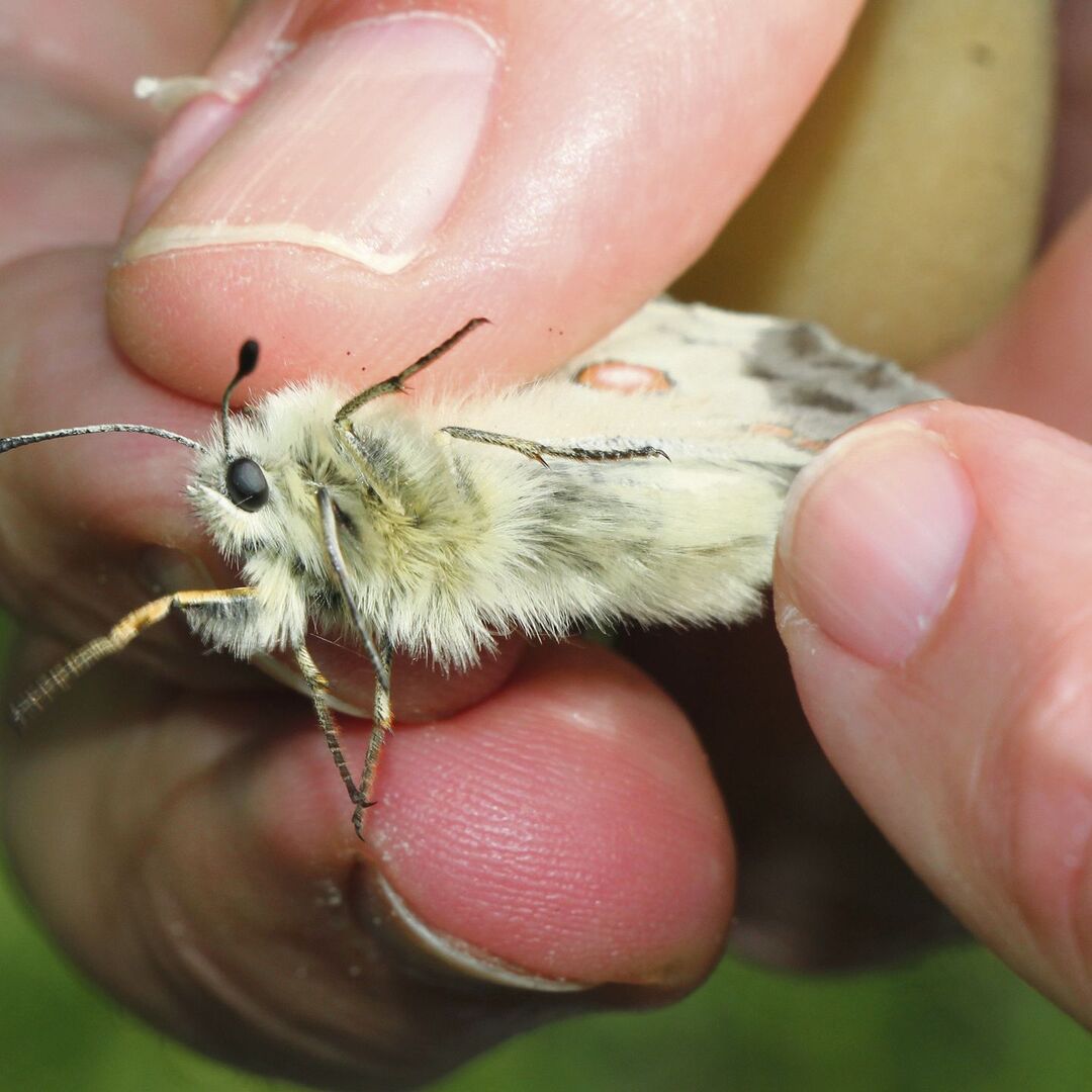 «Hier, ein Apollofalter!», ruft Hans-Peter Wymann plötzlich begeistert und fügt hinzu: «Eine ikonische Art der Alpen.» Er stapft los, schwingt seinen sackartigen Kescher an der langen Stange und schon ist der Falter gefangen. Vorsichtig holt er ihn zwischen zwei Fingern heraus. «Das sind sehr robuste Tiere», kommentiert er und weist auf den stark behaarten Körper hin. «Ein Schutz vor der Kälte in den Bergen. Das hier ist ein Männchen. Weibchen sind etwas weniger behaart.» Tatsächlich sieht der Thorax pelzig aus. Bald darauf flattert das Tier unbekümmert im Sonnenlicht zu einer Flockenblume.