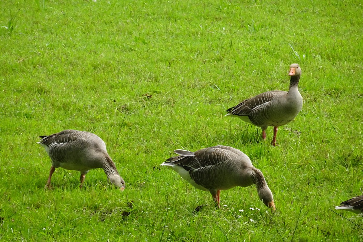 In einer von Hecken umsäumten Wiese zupfen Graugänse Gras. Immer wieder blicken sie wachsam um sich, dann stecken ihre Schnäbel wieder im Grün. Im Hintergrund ragen die Berge zum Himmel, Wolkenfetzen ziehen am Himmel, im nahen Wald rauscht das Laub.