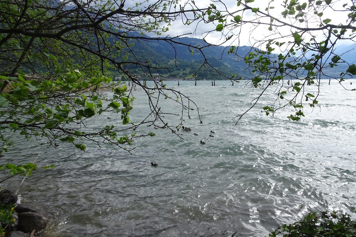 Unter den Bahngeleisen von Interlaken West hindurch, schon fällt der Trubel des Touristenortes ab. Der Wanderweg führt entlang des Schiffskanals, denn Kursschiffe von Thun her pflügen durch den See und Kanal bis unterhalb des Bahnhofs Interlaken West. Bald schon liegen die letzten Häuser zurück, auf saftigen Weiden grasen Kühe, Pappeln rauschen am Kanalufer im sachten Wind, Kohlmeisen huschen durch das Geäst.