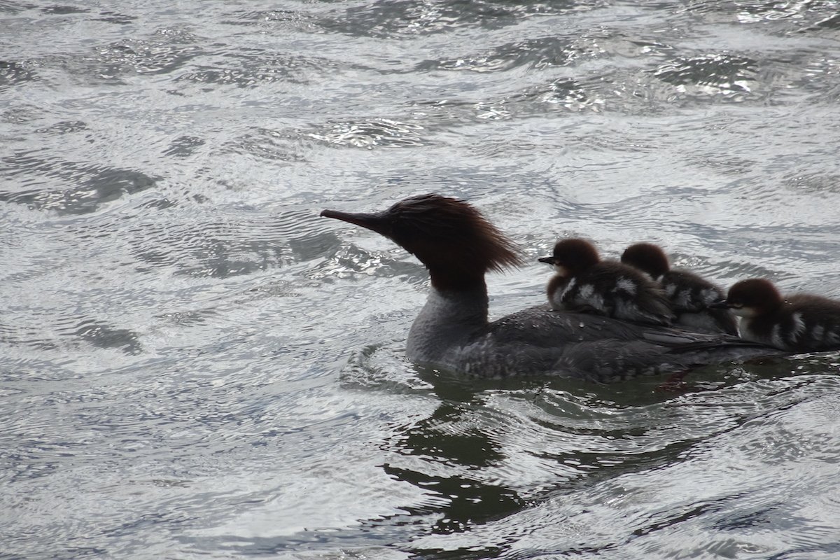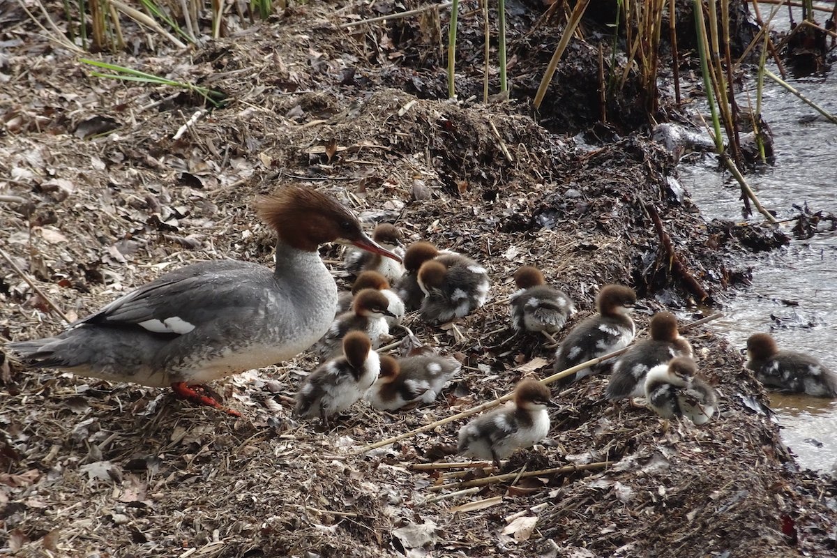 Der Wind frischt auf, peitscht Wellen gegen das Ufer. Unbeirrt schwimmt eine Gänsesäger-Mutter mit 14 Jungen in den Wellen. Die kleinen schwarz-weissen Flaumbällchen rudern, doch zwei haben es sich auf dem Rücken der Mutter gemütlich gemacht. Sie kommen nicht nur bequem und trocken vorwärts, sind sie da doch auch vor Hechten sicher, die im nahen Schilfbestand lauern könnten.