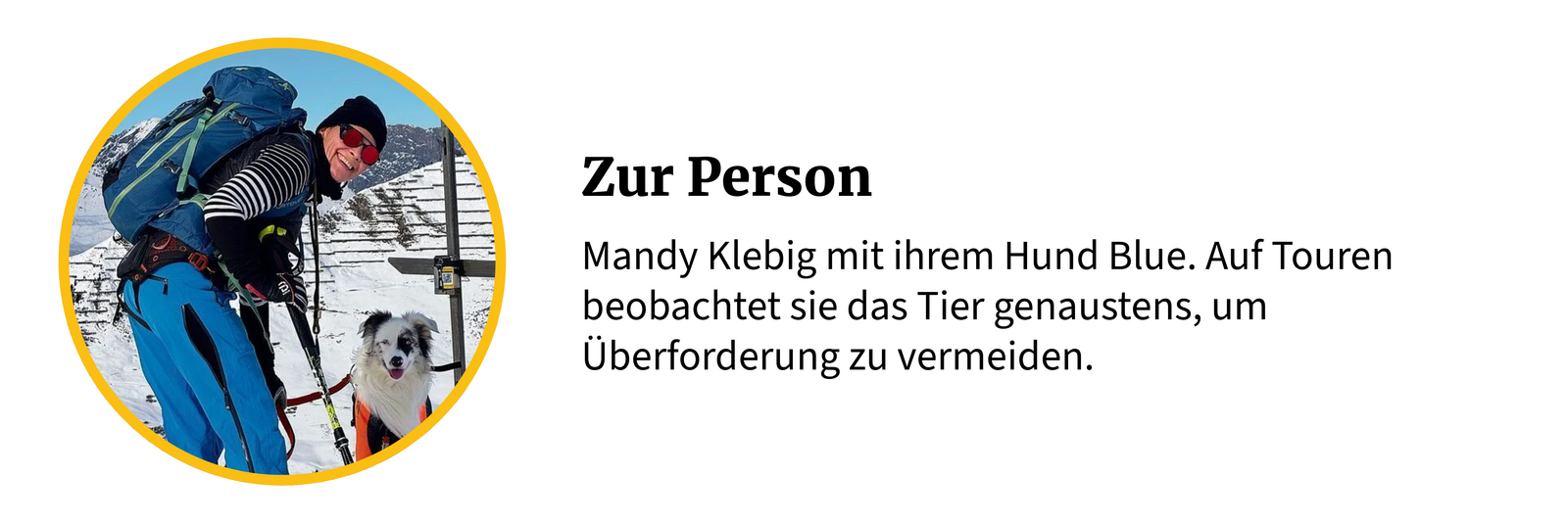 Mandy Klebig: Auf Skitouren oder Winterwanderwegen wähle ich Strecken mit wenigen Menschen aus und achte auf sichere Lawinen- und Schneeverhältnisse. Oft brechen wir frühmorgens auf, damit er frei laufen kann. Wenn mein Hund signalisiert, dass es genug ist, passe ich die Route an oder trage ihn auf der Skiabfahrt. Besonders bei längeren Touren legen wir regelmässig Verpflegungspausen ein. Eine ausreichende Hydration ist unverzichtbar – Schnee ist niemals ein Ersatz für Wasser.