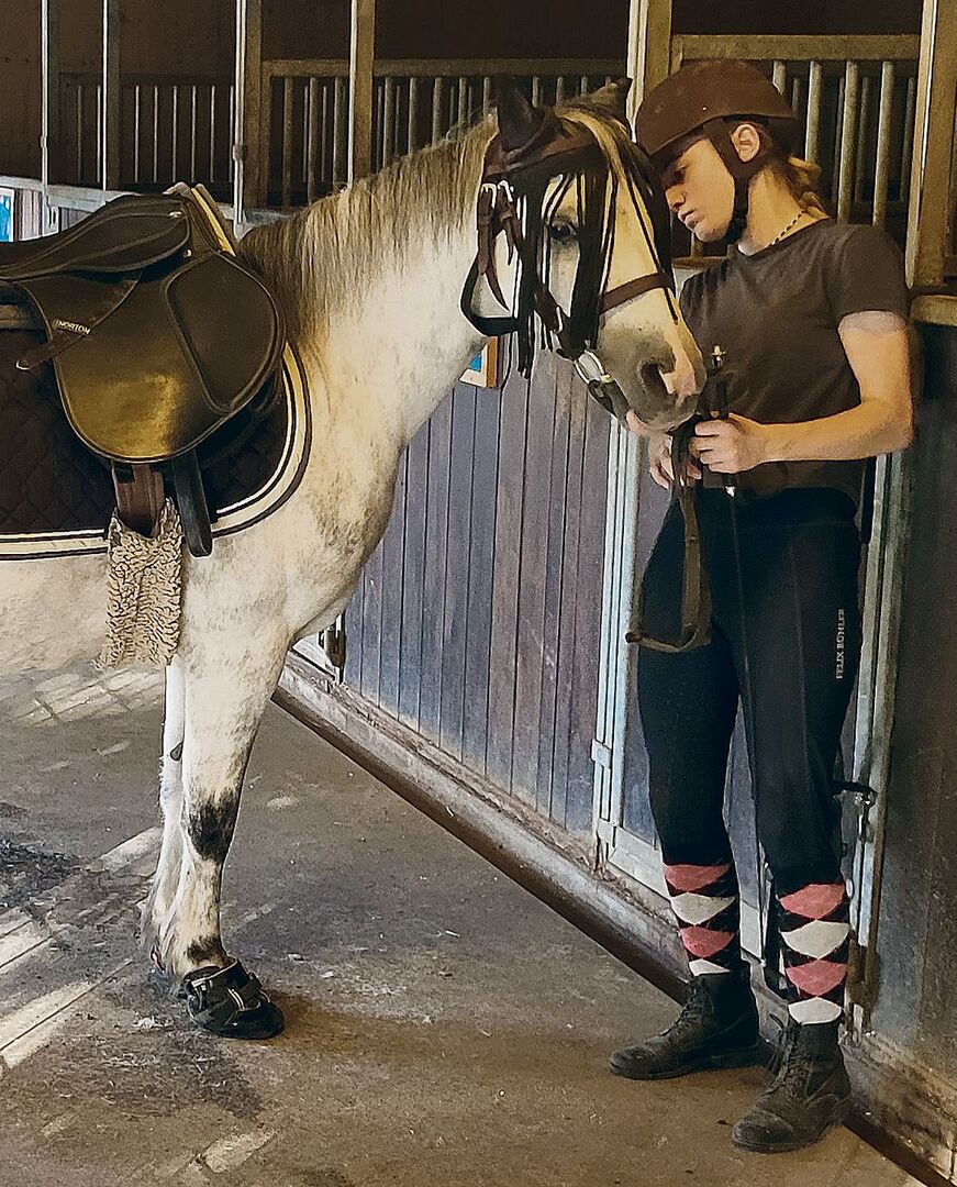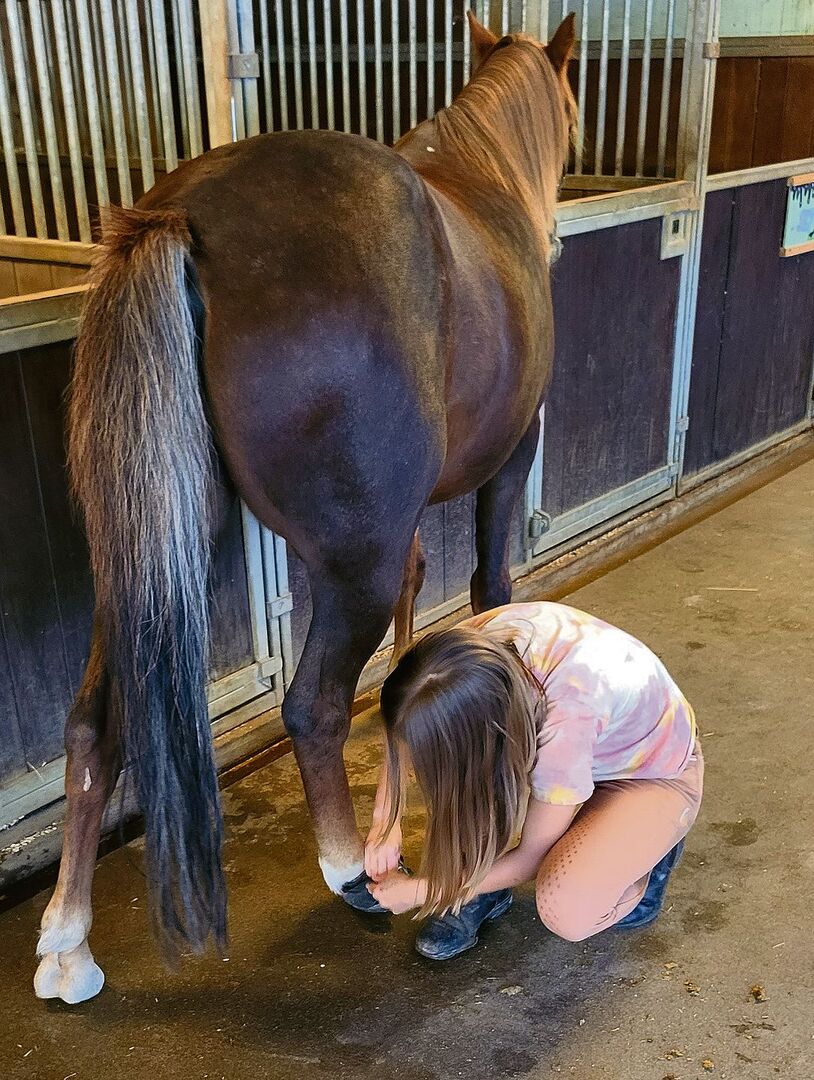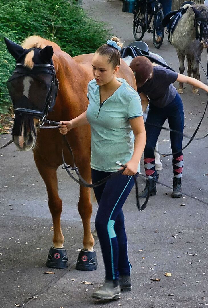 Als es heute ans Ausreiten geht, striegeln die Mädchen ihre Ponys und legen ihnen dann die Reithalfter an und die Sättel auf, wie sie es gelernt haben. Dabei ist immer eine der zwei Fachmitarbeitenden präsent. Sie instruieren die Mädchen, geben Tipps und Hinweise und helfen, wenn es Schwierigkeiten gibt. Inzwischen ist auch das vierte Mädchen eingetroffen, das wegen eines Zahnarzttermins heute den Stalldienst verpasst hat. Die 15-jährige Thalya reitet inzwischen das grösste Pony, einen Haflinger-Irländer-Mix. Heute hat Thalya Mühe, dem Tier die Hufschuhe so überzuziehen, dass sie richtig sitzen. Bea Weber hilft ihr dabei und pflegt gleich noch eine Wunde am Po des Ponys. Die Hufschuhe schonen beim Ritt auf den Kieswegen im Waidwald die unbeschlagenen Hufe der Tiere.