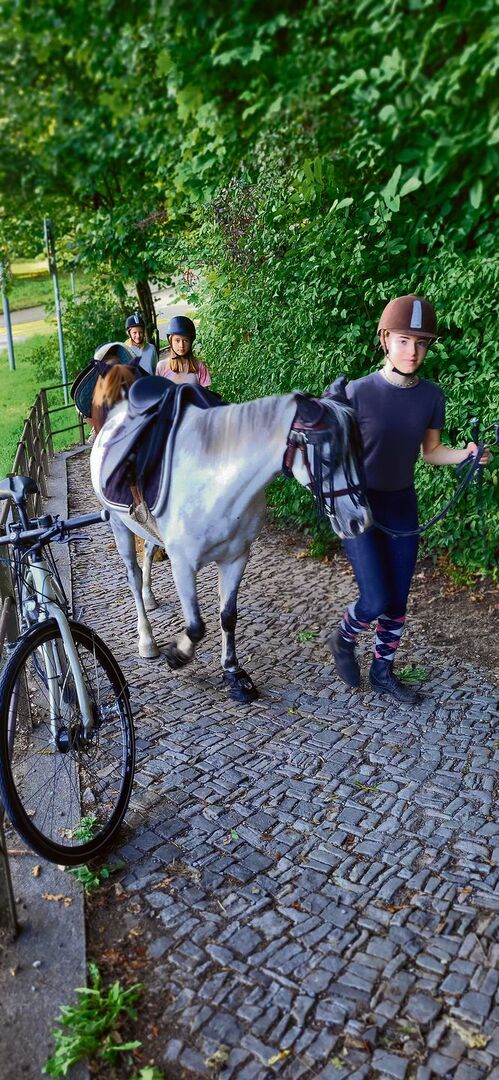 Mädchen, die mindestens drei Jahre dabei sind, dürfen sogar ohne Begleitung mit den Tieren in den Wald. Wenn nach der Stallarbeit nur wenig Zeit bleibt, führen die Mädchen die Ponys, Esel und Lamas am Strick. Wenn mehr Zeit ist, dürfen sie nach dem Überqueren des Bucheggplatzes in den Sattel steigen. Zum grossen Glück führen über die riesige Kreuzung mit sechs mehrspurigen Strassen und etlichen Tram- und Bushaltestellen ausladende Fussgängerbrücken. Auf den breiten Brücken können Fussgänger, Velofahrerinnen und auch die Tiere den Bucheggplatz gefahrlos überqueren.