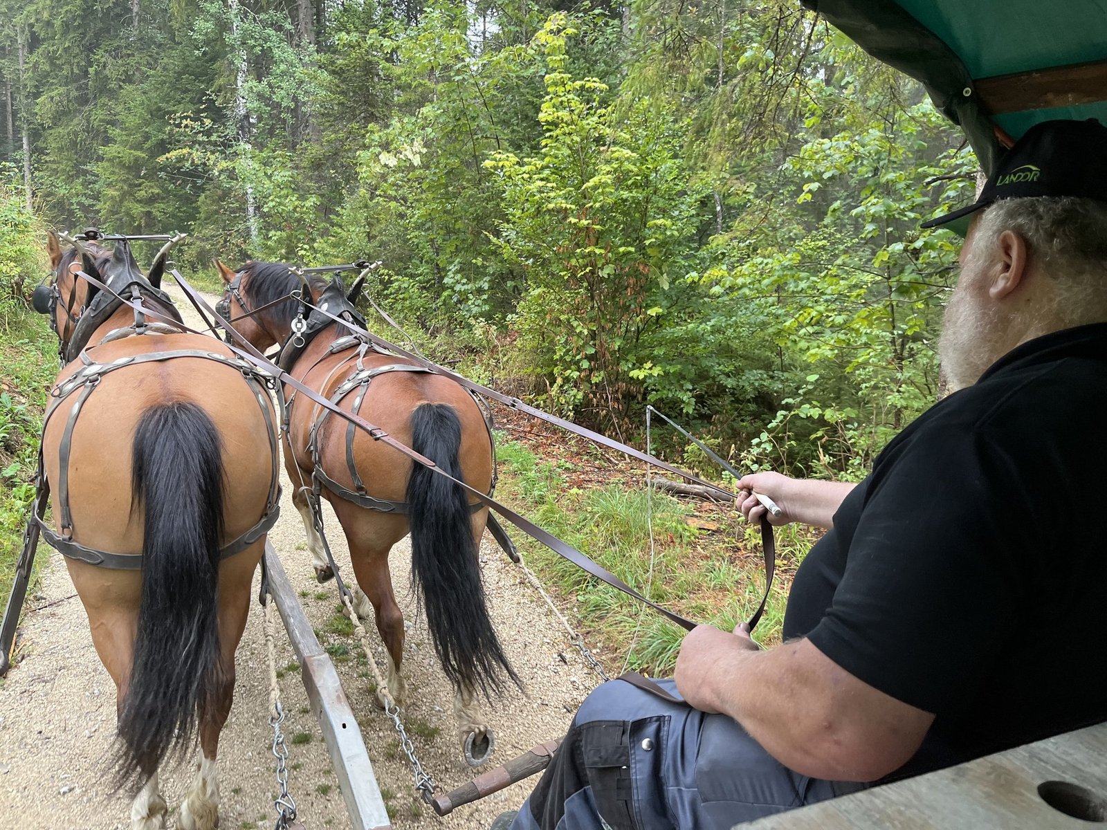Etwas weniger rasant sind Nesquik und Eros unterwegs. Die beiden braunen Freiberger-Wallache haben auch deutlich mehr Gewicht zu transportieren. Denn sie ziehen den Planwagen, den Laurent Jullierat lenkt. Der bärtige Jurassier sucht eigentlich aufgrund seines Alters einen Nachfolger für seinen Kutschbetrieb mit dem klingenden Namen «Chars attelés Obelix». «Der Aufwand für eine Fahrt ist enorm, die Pferde müssen ja jeweils geputzt, ein- und wieder ausgeschirrt werden und den Wagen gilt es auch in Schuss zu halten.» Dafür ist dann das Erlebnis Entspannung pur – mindestens für die Gäste. Schön die Schlaglöcher umzirkelnd holpert die Kutsche gemächlich über einsame Wald- und Wiesenwege. Im Wald hüpft ein Eichhörnchen über den Weg und auf den Weiden kommen viele neugierige Pferdekumpanen angetrabt, um dieses altmodische Gefährt von Nahem zu mustern. Weit und breit ist keine Menschenseele zu sehen. Nur in den Weilern, die wir durchfahren, weht ab und an ein freundliches«Salut!» zu uns herüber, Juillerat und sein Gespann sind weitherum bekannt.