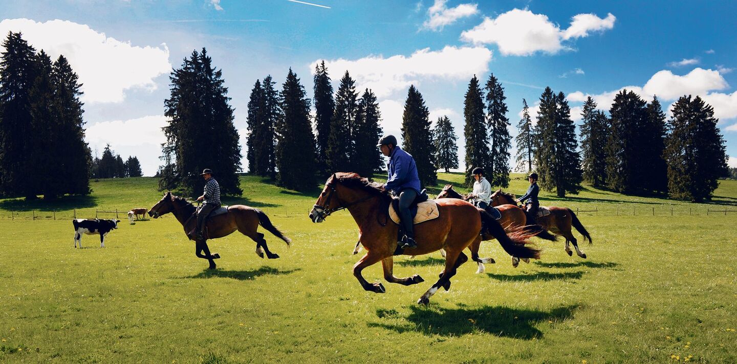 Das Hochplateau der Freiberge ist bekannt für seine spezielle Landschaft. Weiden, so weit das Auge reicht, mit Fichten und sanften Hügeln. Genauso berühmt sind die hier heimischen Freiberger Pferde. Was liegt also näher, als den Jura mit dem Ross zu erkunden?