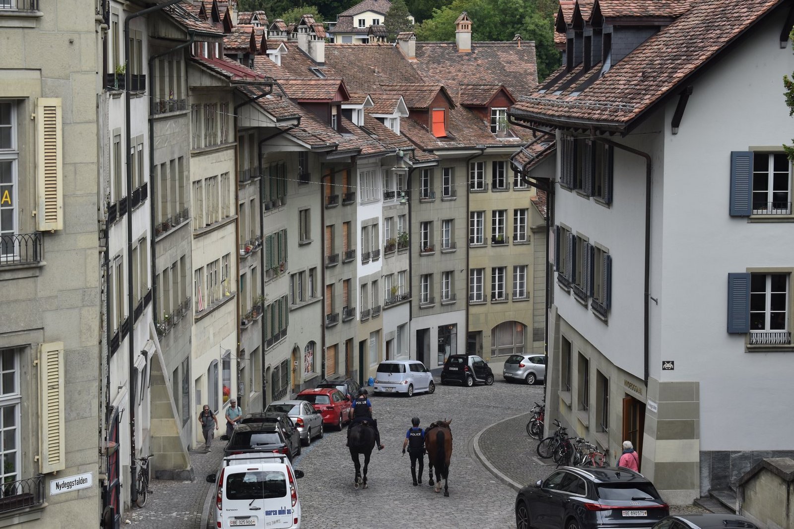 Zwar habe jedes Einsatzmittel seine Vor- und Nachteile, erklärt Remo Jaggi, der seit der Jahrtausendwende zum Reiterzug gehört. «Gegenüber Fusspatrouillen ist der grosse Vorteil der berittenen Patrouille die bessere Sichtbarkeit und die Bürgernähe.» Von der erhöhten Position aus habe man einen besseren Überblick und komme schneller mit Menschen in Kontakt als zu Fuss. «Die Reaktionen der Bevölkerung sind durchwegs positiv. Zudem sind wir Reitenden für viele ein schönes Fotosujet.» Was sich nicht nur auf den Runden im Rosengarten, sondern auch danach zeigt: Jaggi und Huber verlassen die Parkanlage und reiten den Aargauerstalden hinunter Richtung Bärengraben – Blicke und Handys folgen ihnen aus jeder Richtung.