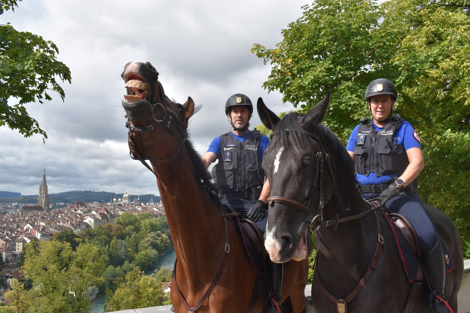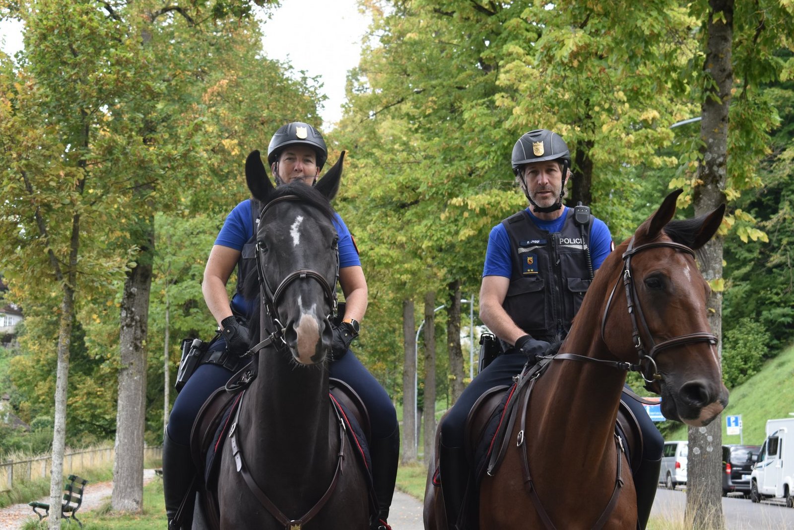 Auch an einem grauen September-Tag, der weder durch schönes Wetter noch durch herbstliche Farbenpracht heraussticht, halten sich viele Leute im Rosengarten auf, machen Fotos und trinken einen Kaffee. Doch plötzlich liegt die Aufmerksamkeit der Anwesenden nicht mehr bei der Aussicht. Hufgeklapper ertönt, zwei Pferde nähern sich. Die Kleidung der darauf sitzenden Personen – einem Mann und einer Frau – verrät, dass es sich nicht um Freizeitreitende handelt: Die Reitenden tragen nicht nur Reiterhelme und -hosen, sondern auch blaue Uniformen, die mit Namenszügen und Logos versehen sind und darüber eine Sturzweste. Darauf macht ein einzelnes Wort in Grossbuchstaben in allen Sprachen klar, dass die Polizei im Rosengarten eingetroffen ist. Und sofort ist die Aussicht auf die denkmalgeschützte Altstadt nur noch das zweitinteressanteste Fotosujet in der bekannten Parkanlage.