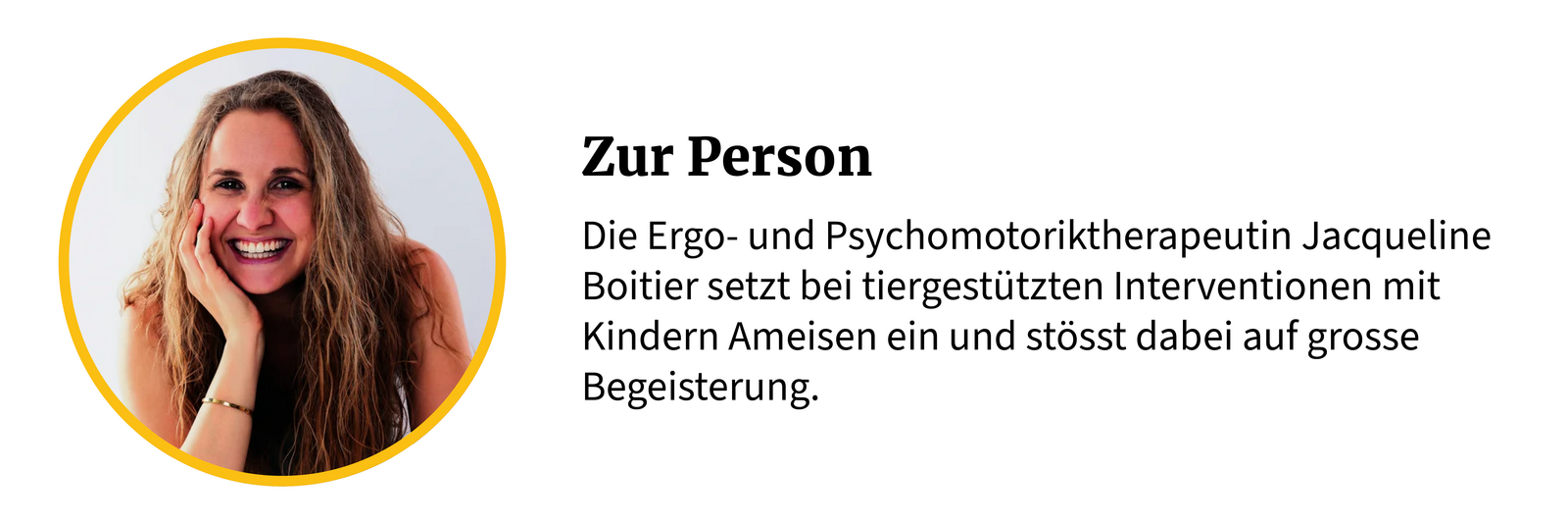 Mit ihrem Formicarium ist Jacqueline Boitier als Therapeutin derzeit noch allein auf weiter Flur, doch ihre Pionierarbeit, die an einer Zürcher Primarschule begann und jetzt in der Selbstständigkeit weitergeht, ist ihr jede Minute wert. Mit ihrem Experiment hat sie nicht nur bei Dutzenden von Kindern das Interesse für den Kosmos Natur geweckt und sie grob- und feinmotorisch gefördert, sondern auch die klassische Psychomotoriktherapie mit der tiergestützten Intervention um eine weitere Option erweitert. «Insekten haben ein so enormes Potenzial», ist sich Boitier sicher und plant bereits ihre nächsten Projekte.