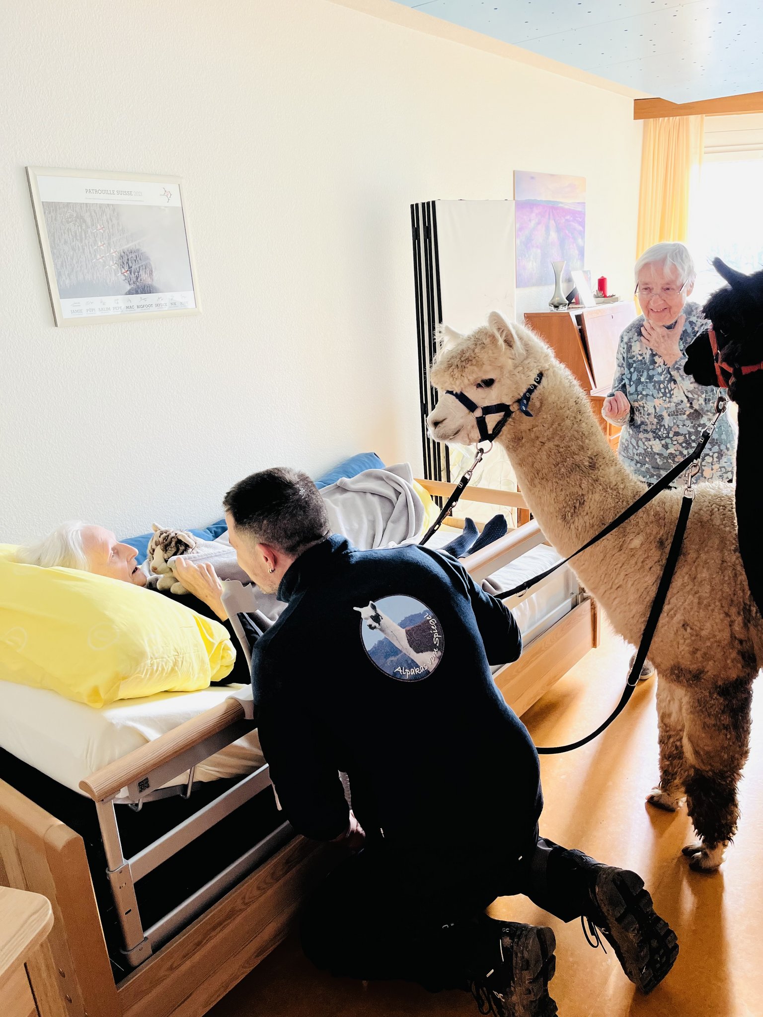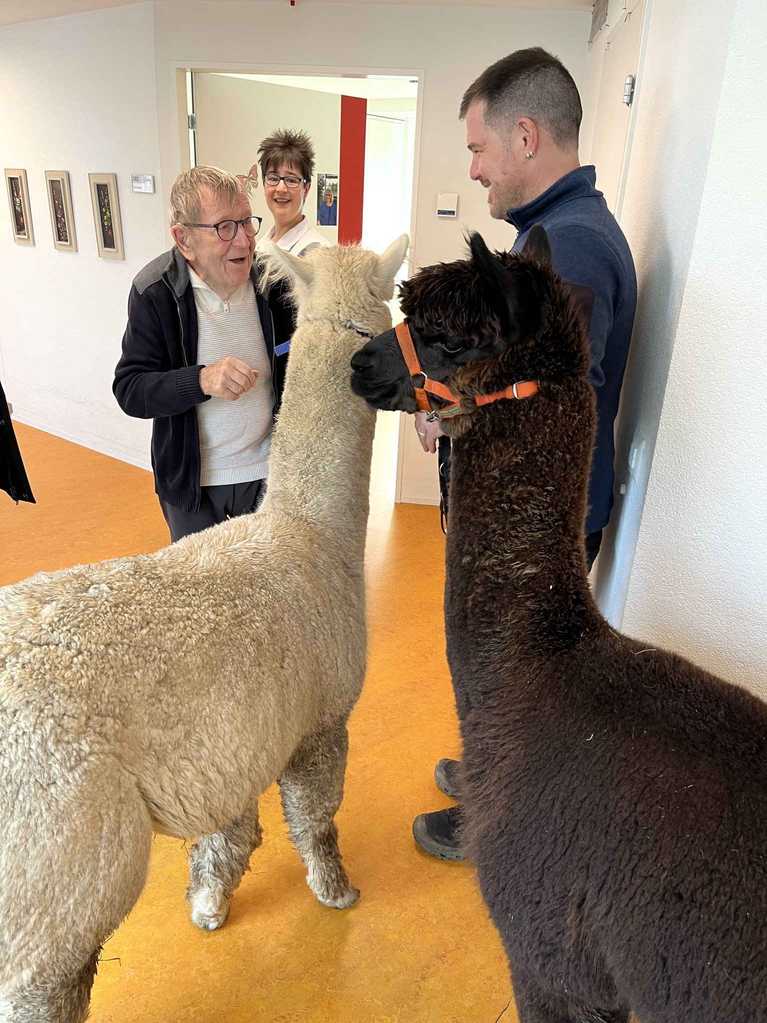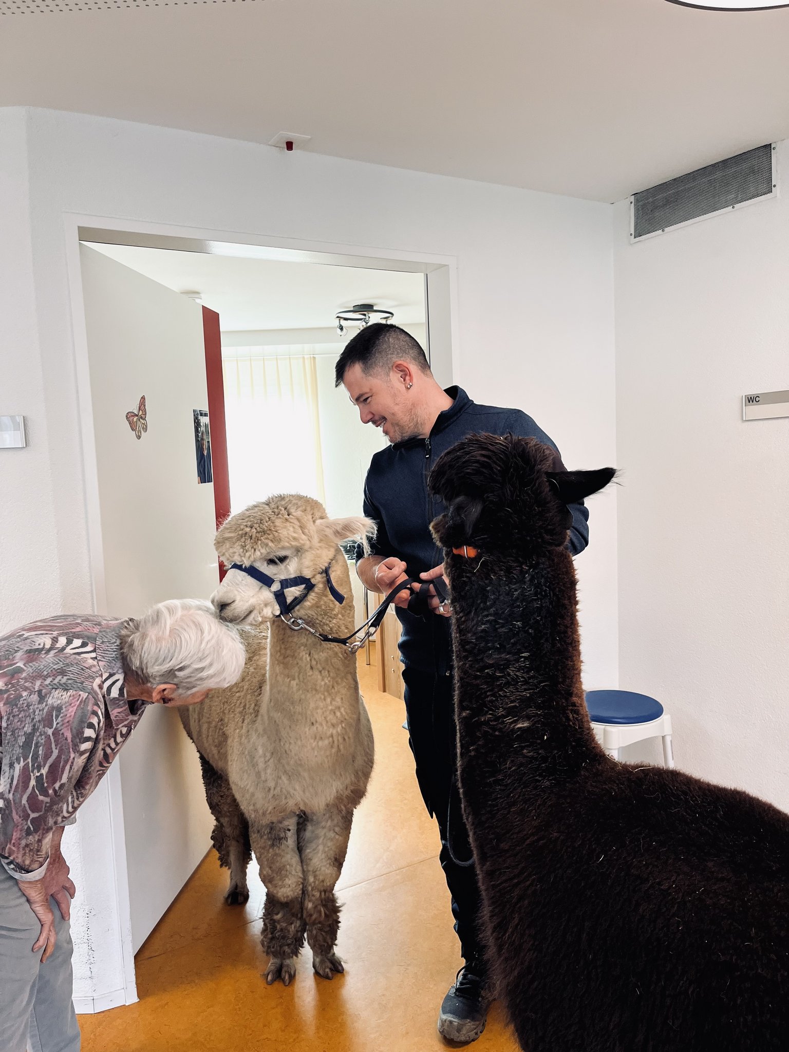 Lanzarote und Rockstar sind eigentliche Routiniers und scheinen zu ahnen, was in den nächsten Stunden auf sie zukommt. Seelenruhig sitzen sie im hinteren Teil des Kleinlasters und sind sofort wieder auf allen Vieren, als der Wagen am Zielort stoppt. Stolzieren durchs Entrée des Altersheims, wo sich die Köpfe aller Mitarbeitenden und Besucherinnen nach diesen vifen Kreaturen mit den langen Hälsen, dunklen Kulleraugen und flauschigem Fell drehen. Im Lift nach oben geben die Tiere kurz dem Druck des Liftes nach und balancieren sich aus, um dann wieder erhobenen Hauptes Richtung Demenzabteilung zu schreiten.