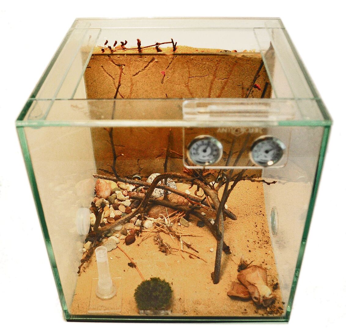 Doch mit der Anschaffung eines Formicariums und den Ameisen war es nicht getan. Boitier recherchierte, vernetzte sich mit Ameisenspezialisten in Zoos, setzte sich intensiv mit den Bedürfnissen der Tiere auseinander, experimentierte, lernte durch genaues Beobachten. Denn Temperatur und Luftfeuchtigkeit müssen im Lot sein und auch die Winterruhe von Oktober bis März im kühlen Keller ist Teil des Programms. Ebenso anspruchsvoll: der Transport dieses Würfels. Starke Erschütterungen können das Nest zerstören.