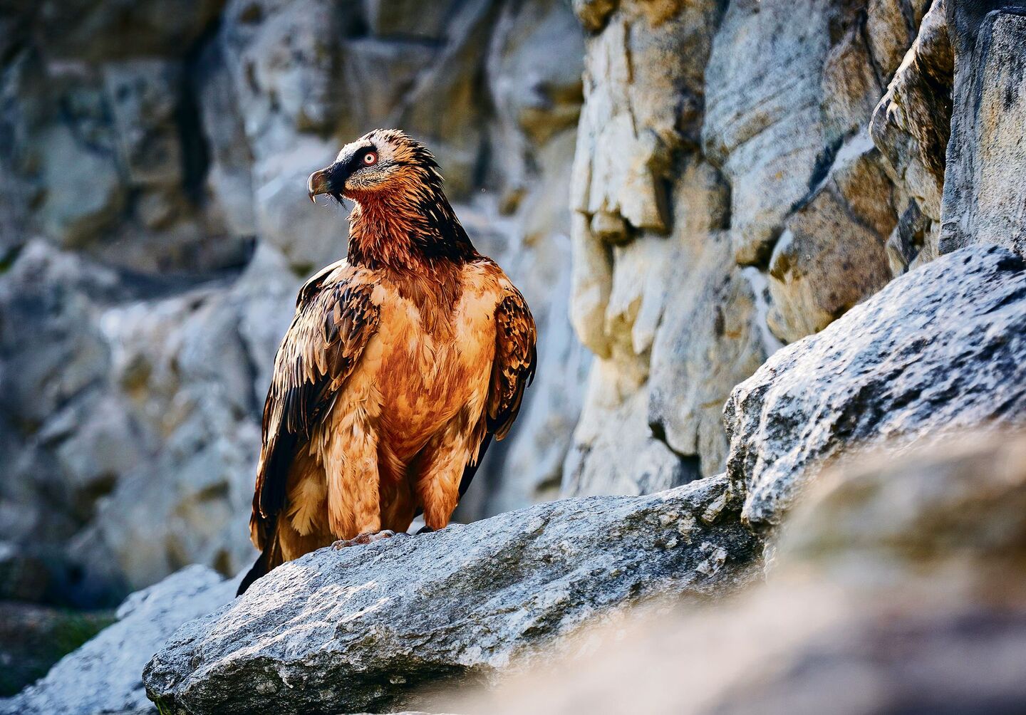 Der schwarze Bart ist ein exquisites Erkennungszeichen, das kein anderer Geier hat. Und, der Bartgeier hält etwas auf sich. So sehr, dass er sogar seine Federn färbt. Das Brustgefieder von Bartgeiern in der Natur ist rostrot. Sie legen sich die attraktive Farbe zu, indem sie in eisenhaltigem Wasser baden. «Warum die Geier das machen, ist nicht ganz klar», sagt Stefan Bachmann. Er mutmasst: «Vielleicht hat dieses Verhalten eine soziale Funktion.»