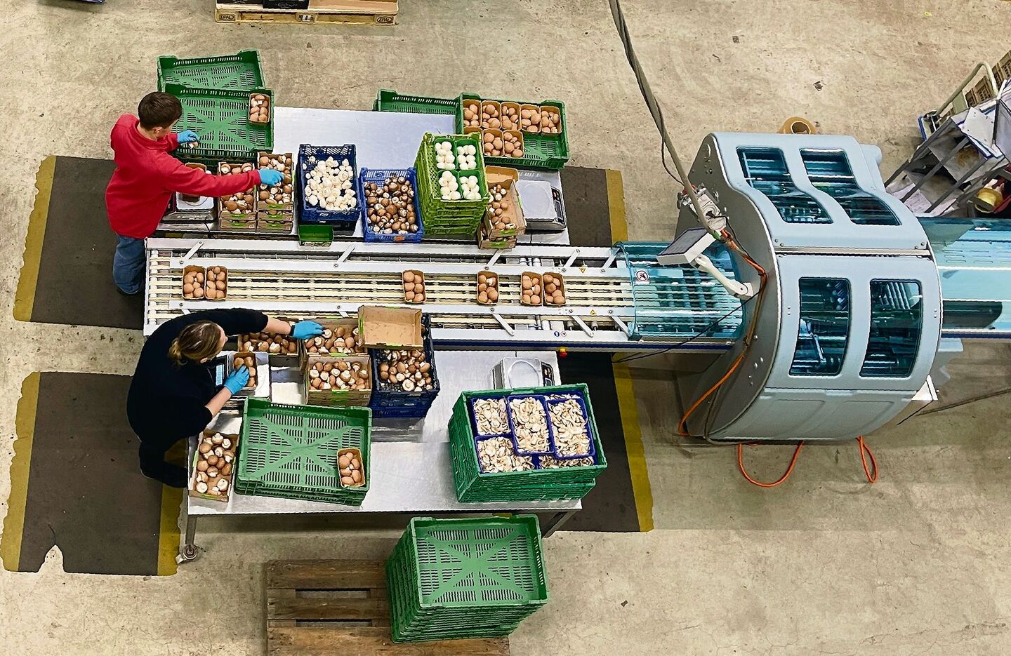 In das pasteurisierte Substrat aus Mist kommen ganz zum Anfang mit Pilzsporen geimpfte Getreidekörner. So wächst zwar kein Getreide, dafür aber ein weit verzweigtes und ineinander verwachsenes Myzelium, die Wurzeln des Pilzes, aus denen wenige Wochen später die reifen Fruchtkörper herausschauen. Damit das passiert, wird dem Pilz durch eine Absenkung der Temperatur und Luftfeuchtigkeit vorgegaukelt, dass der Herbst vor der Tür steht. Dann schiessen die hellen Köpfe aus dem Myzelium und können geerntet werden. Von der Aussaat bis zur Ernte dauert es bei braunen Champignons lediglich zwei Wochen, bei weissen etwa zweieinhalb Wochen.