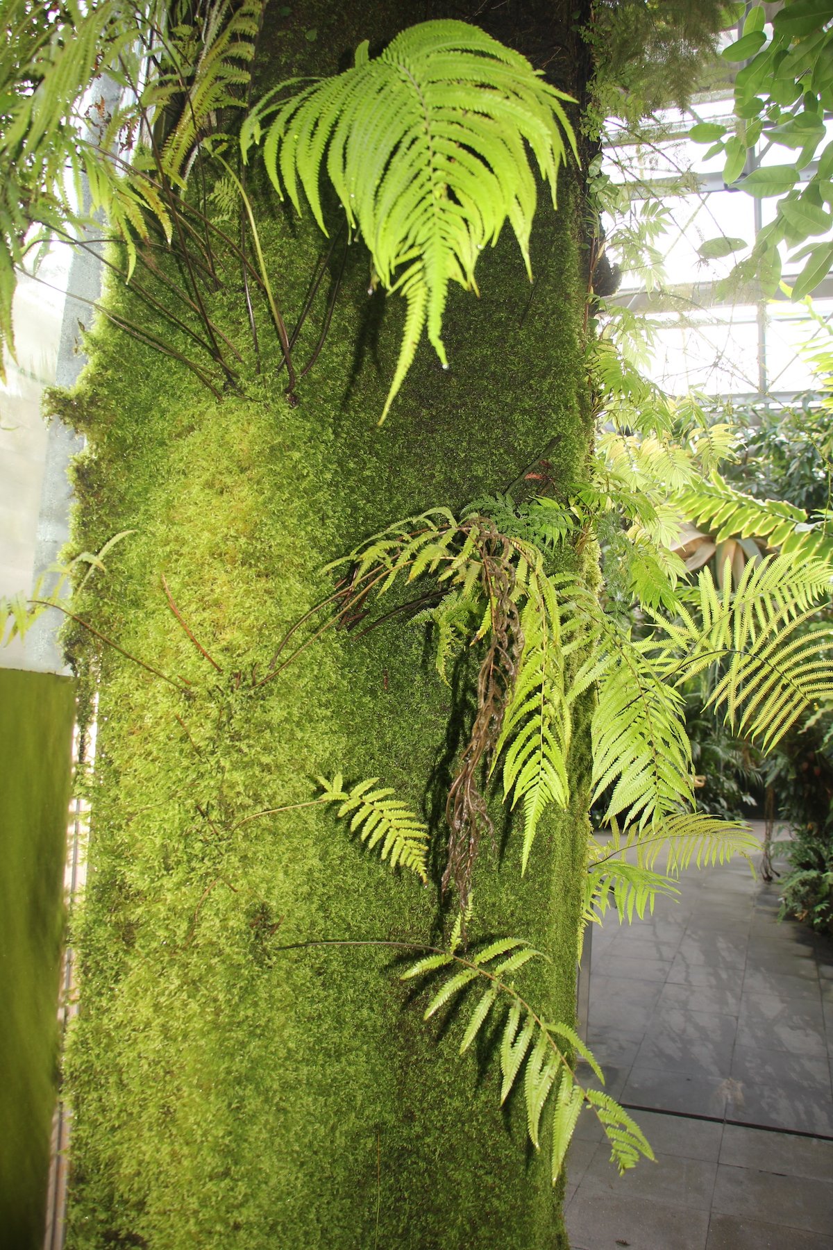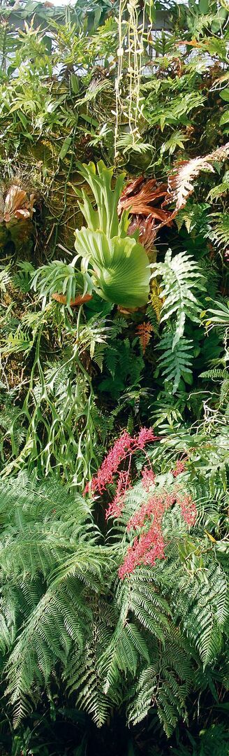 Auch an Mauerpfeilern wachsen Anthurien, Orchideen, Rhipsalis-Arten und Bromelien wie im Regenwald einer Andenflanke Perus. Andreas Hofer spricht von den Bildern, die er im Kopf habe und umsetze. Er ist in die Tropen gereist und hat die natürlichen Biotope studiert. Dem leidenschaftlichen Terrarianer und Aquarianer ist es wichtig, dass keine künstlichen Materialien zu sehen sind, wenn er seine Pflanzen an den Mauern anbringt.