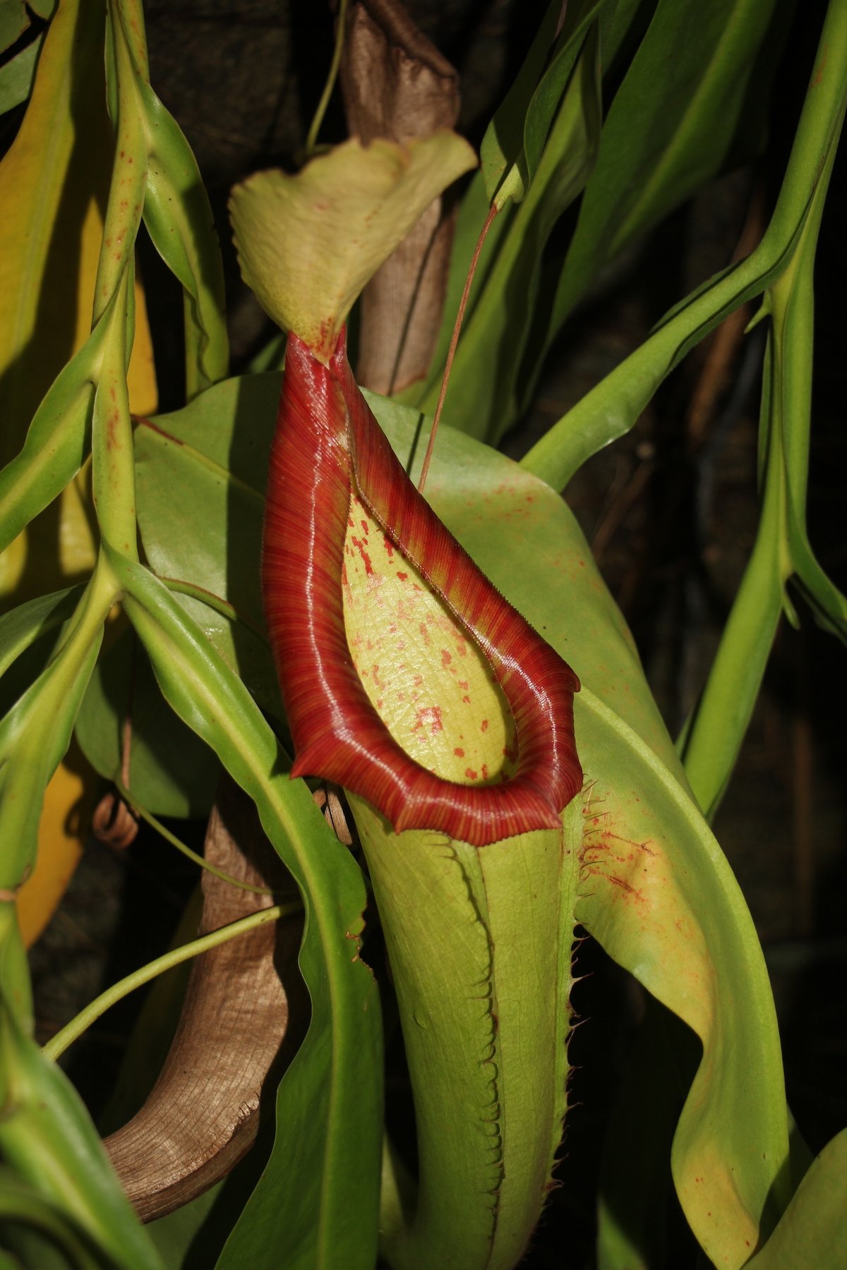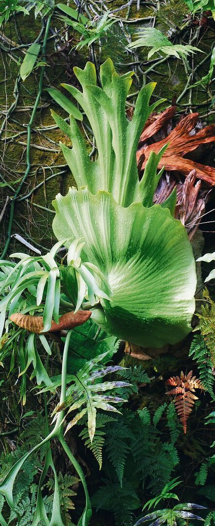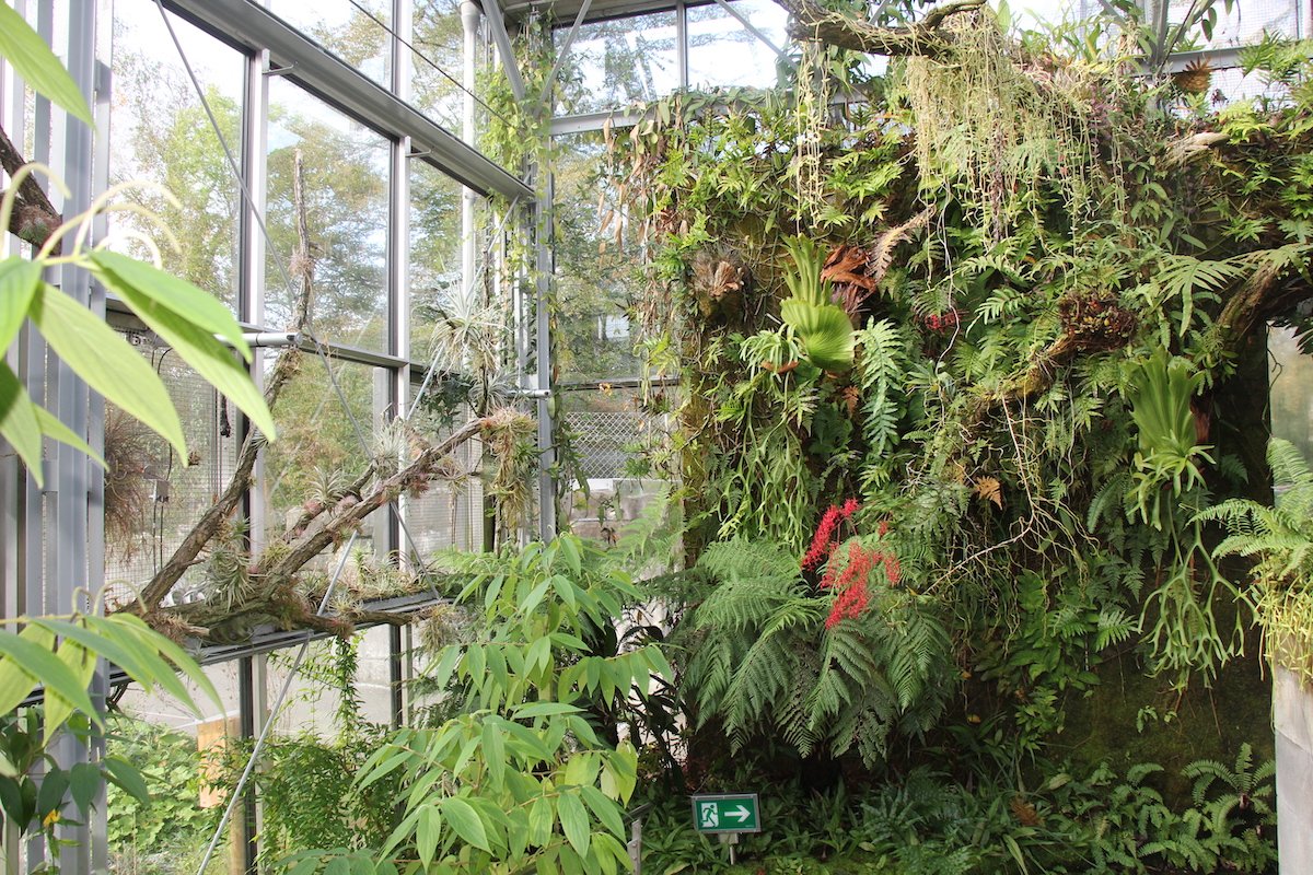 Die grossen, gezähnten Blätter des Geweihfarns spriessen aus einem rundlichen, braunen Ballen, der sich an einer bemoosten Wand festzukrallen scheint. Darum herum, von oben bis unten: tropische Pflanzenvielfalt. Orchideen, Ameisenpflanzen, Bärlappgewächse, Kannenpflanzen, Wachsblumen-Arten und Farnwedel leuchten in unterschiedlichen Grüntönen. Die Szenerie spielt nicht in einer südostasiatischen Schlucht, sondern im Vivarium des Tierparks Bern.