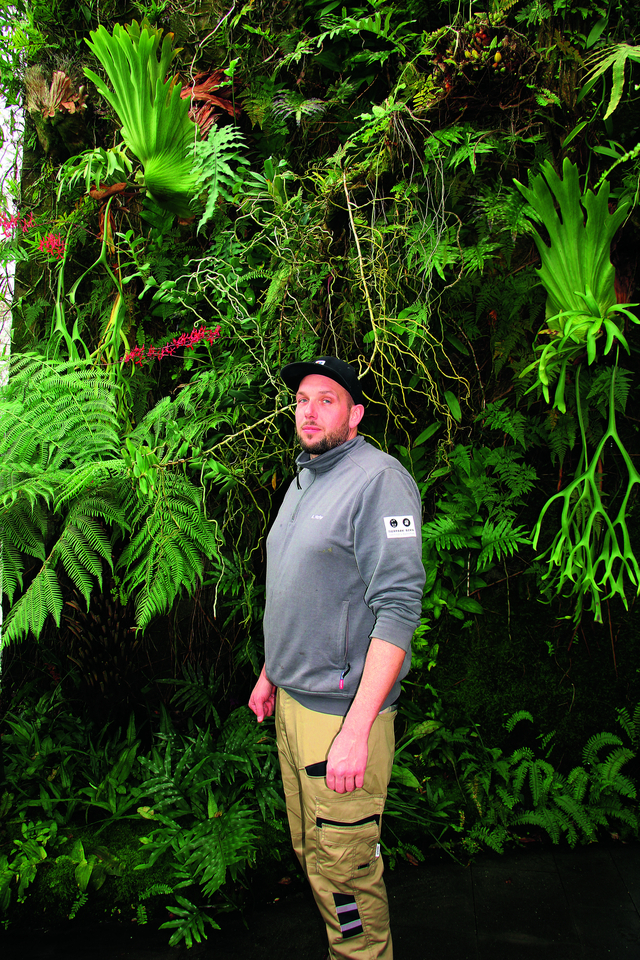 Andreas Hofer verrät, wie seine grünen Wände funktionieren: «Der Wurzelballen der an der Mauer aufgesetzten Pflanzen muss feucht bleiben. Darum umgebe ich ihn mit Sphagnum-Moos und Agar-Agar, einem Algenprodukt mit einer Konsistenz ähnlich der Gelatine.» Damit liessen sich auch die Aufbindematerialien kaschieren. «Der Stein dahinter saugt Wasser auf und gibt es langsam an die Pflanzen ab. Ich besprühe sie jeden Morgen, wenn es heiss ist auch nachmittags, mit Osmosewasser.» Dabei handelt es sich um entkalktes Wasser, dem Regenwasser ähnlich.