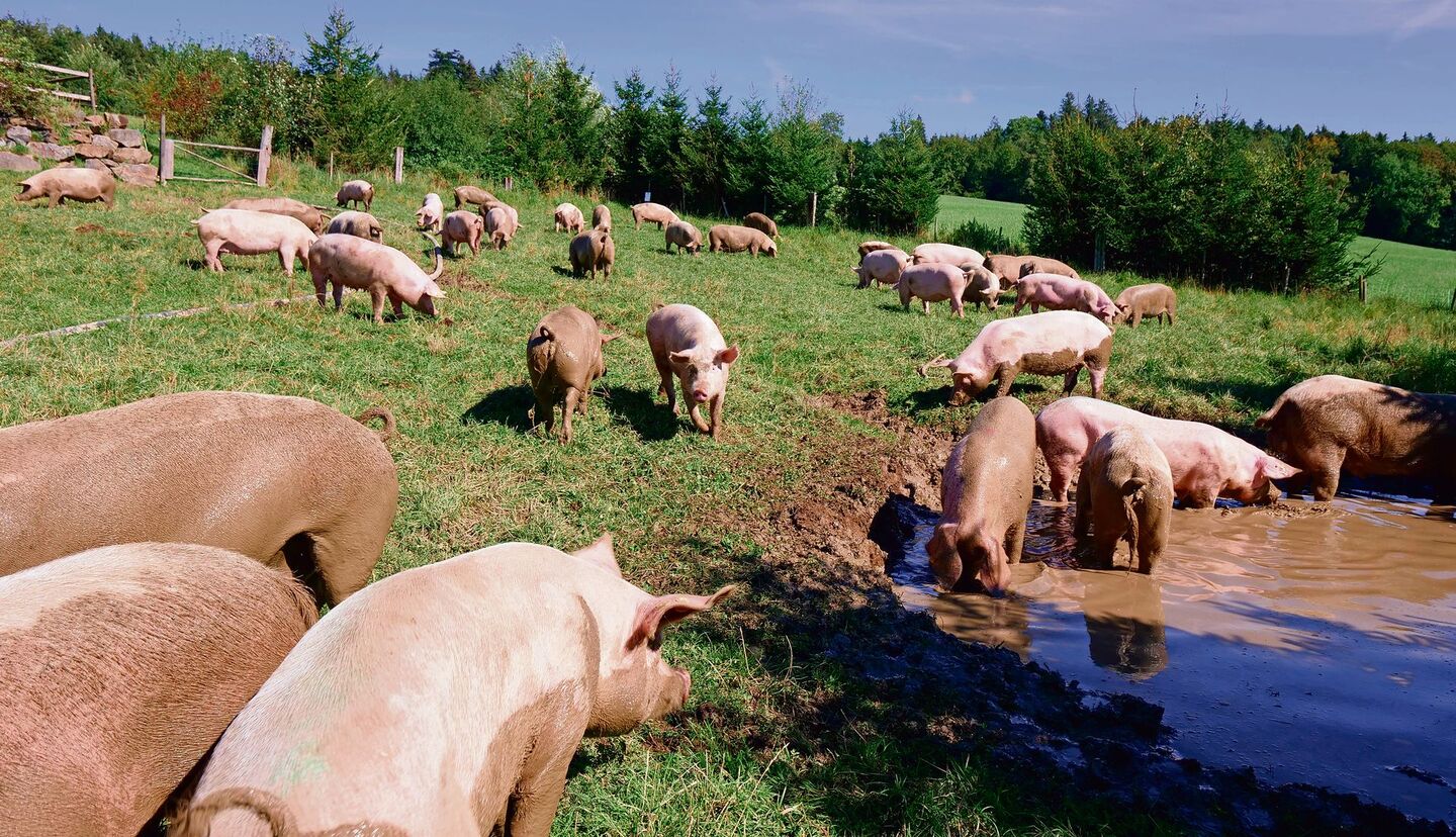 Wobei, wirklich zu Gesicht bekommt die Bevölkerung die insgesamt 1,35 Millionen Schweine, die laut der Agrardatenerhebung des Bundesamtes für Statistik vom Jahr 2022 auf 5467 Betrieben in der Schweiz leben, seltener als andere Nutztiere. Denn sie sind grossmehrheitlich in Ställen gehalten. Die Freilandhaltung von Schweinen ist in der Schweiz eine Nischenproduktion. Der Bioanteil beim Schweinefleisch liegt bei ungefähr zwei Prozent des Gesamtmarktes. Durch klimatische und traditionelle Gegebenheiten, den grossen Landanspruch und gesetzliche Auflagen, beispielsweise im Bereich des Gewässer- und Tierschutzes, stellt das Errichten und Betreiben einer Freilandhaltung eine Herausforderung dar, so das FiBL. Immerhin 60 Prozent der Mastschweine und 74 Prozent der Galtsauen, so werden trächtige Muttersauen bezeichnet, profitieren von einem permanenten Auslauf, sagt Ursula Läderach, Verantwortliche Marketing und Kommunikation von Suisseporcs, dem Schweizerischen Schweinezucht- und Schweineproduzentenverband. 1997 wurde bei uns in der Schweiz die Haltung in Kastenständen verboten und seit 2008 gilt ein Verbot für Vollspaltenböden in Schweinemastbetrieben. Die Schweiz und Norwegen sind weltweit die einzigen zwei Länder, welche die Haltung in Kastenständen verbieten, und im EU-Raum ist die Haltung auf Vollspaltenböden nach wie vor Standard. Dennoch kann bei nicht einmal einem Quadratmeter Raum für eine Sau von 100 Kilogramm und zweieinhalb Quadratmeter für eine Galtsau mit über 200 Kilogramm Gewicht nicht von grosszügigen Platzverhältnissen gesprochen werden. Diese Bedingungen gelten für 32 Prozent der Schweine in der Schweiz, präzisiert Ursula Läderach. Rund 68 Prozent der Mastschweine leben in besonders tierfreundlichen Haltungssystemen und wie oben erwähnt können viele Tiere zusätzlichen Auslauf ins Freie (RAUS-Programm) geniessen.