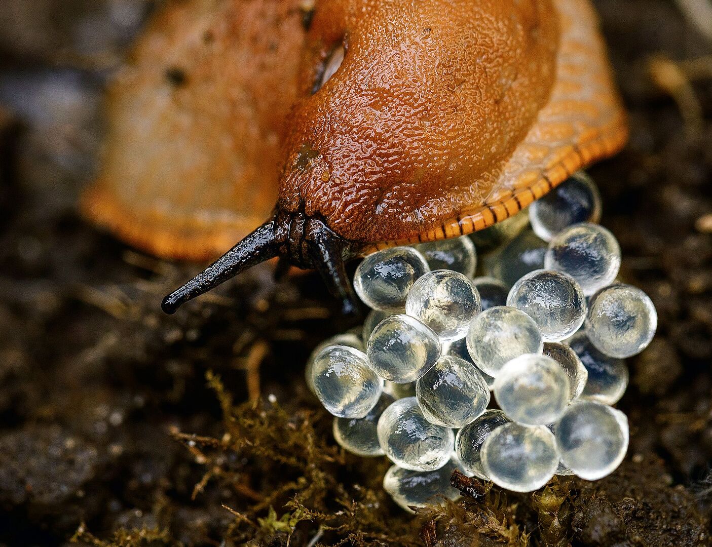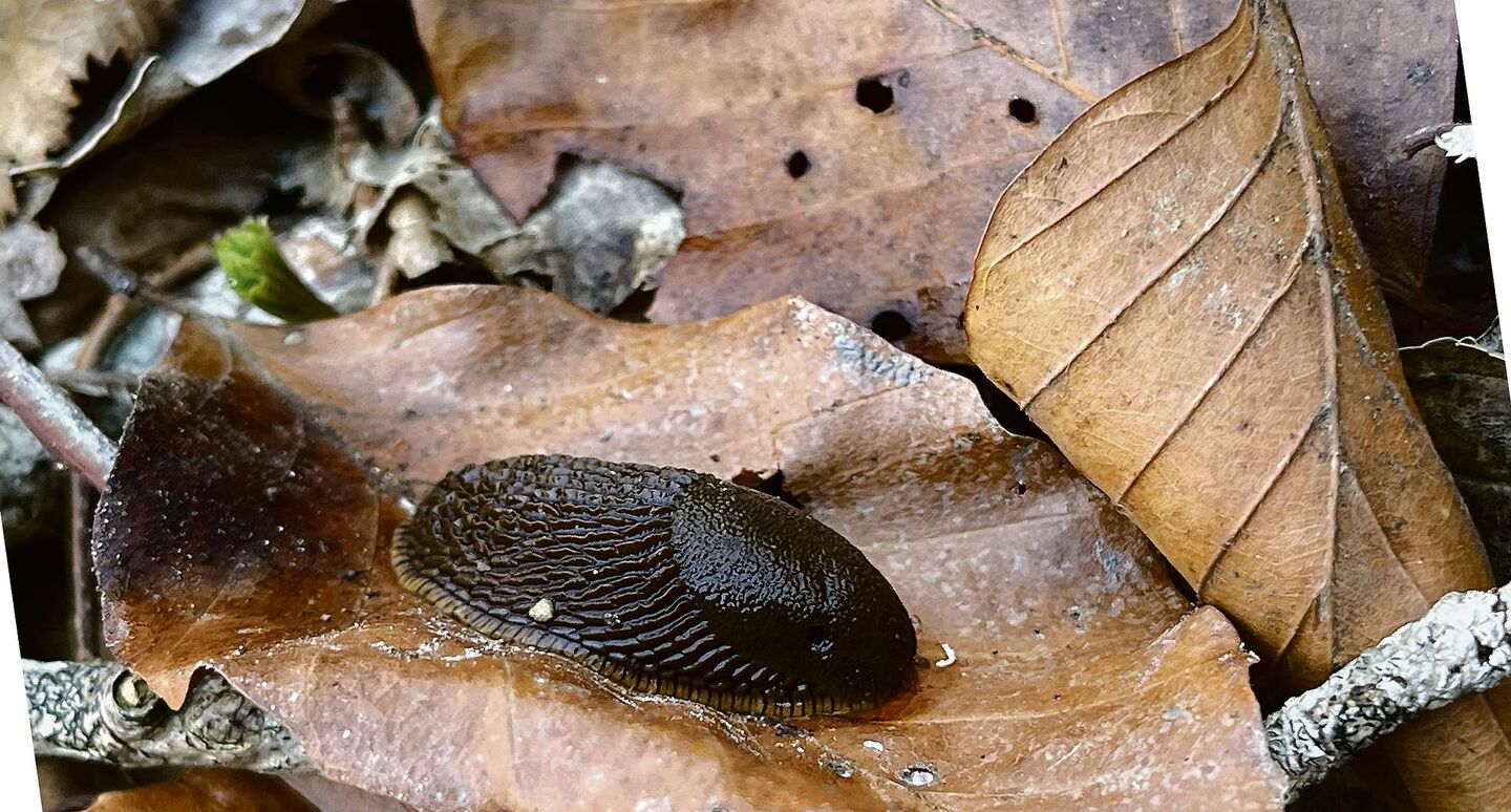 Manchmal werden den heimischen Mollusken auch andere Schnecken zum Verhängnis. Peter Müller hält ein Blatt in die Höhe, auf dem eine dunkelbraune Nacktschnecke klebt. «Das ist eine Spanische Wegschnecke. Sie wird bis zu 15 Zentimeter lang und bedroht als invasives Neozoon die einheimische Rote Wegschnecke.» Die Spanische Wegschnecke (Arion vulgaris) verdrängt ihre Schweizer Schwesternart zunehmend, und paart sich auch mit ihr, sodass Hybriden entstehen und die reine Rote Wegschnecke (A. ater ruber) langsam verschwindet. Auch Nacktschnecken besitzen übrigens meist noch den Rest eines Gehäuses. Dieses haben sie jedoch weitgehend reduziert oder es in ihren Weichkörper hinein verlegt, sodass sie sich nicht mehr zum Schutz darin zurückziehen können.