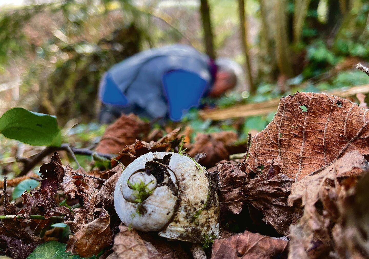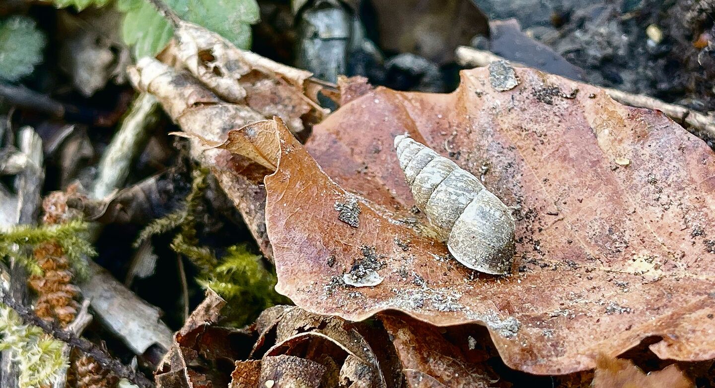 Nahe am Boden tut sich ein völlig neuer Lebensraum auf, der den meisten Augen sonst entgeht. Zwischen Springschwänzen, Käfern und Spinnen finden sich zahlreiche Schneckenhäuser verschiedener Arten. Die bekannten Bänderschnecken sind bereits aktiv und suchen nach geeigneten Paarungspartnern. Am häufigsten sind die Weissmündigen und Schwarzmündigen Bänderschnecken (Cepaea hortensis und C. nemoralis), zu unterscheiden an der namensgebenden Färbung der Häuschenmündung. Trotz des auffälligen Streifenmusters sind sie zwischen dem Laub erstaunlich gut getarnt. Deutlich von den kugeligen Gehäusen der Bänderschnecken unterscheidet sich das des Steinpickers (Helicigona lapicida). Es ist linsenförmig und weist eine deutlich abgezeichnete Kante auf, die man als Kiel bezeichnet. Dadurch ist die Art mit keiner anderenSchnecke verwechselbar. Ihren Namen hat sie vom bevorzugten Lebensraum zwischen Felsen und Mauern, wo sie sich dank der Form ihres Gehäuses gut in enge Spalten zurückziehen kann.