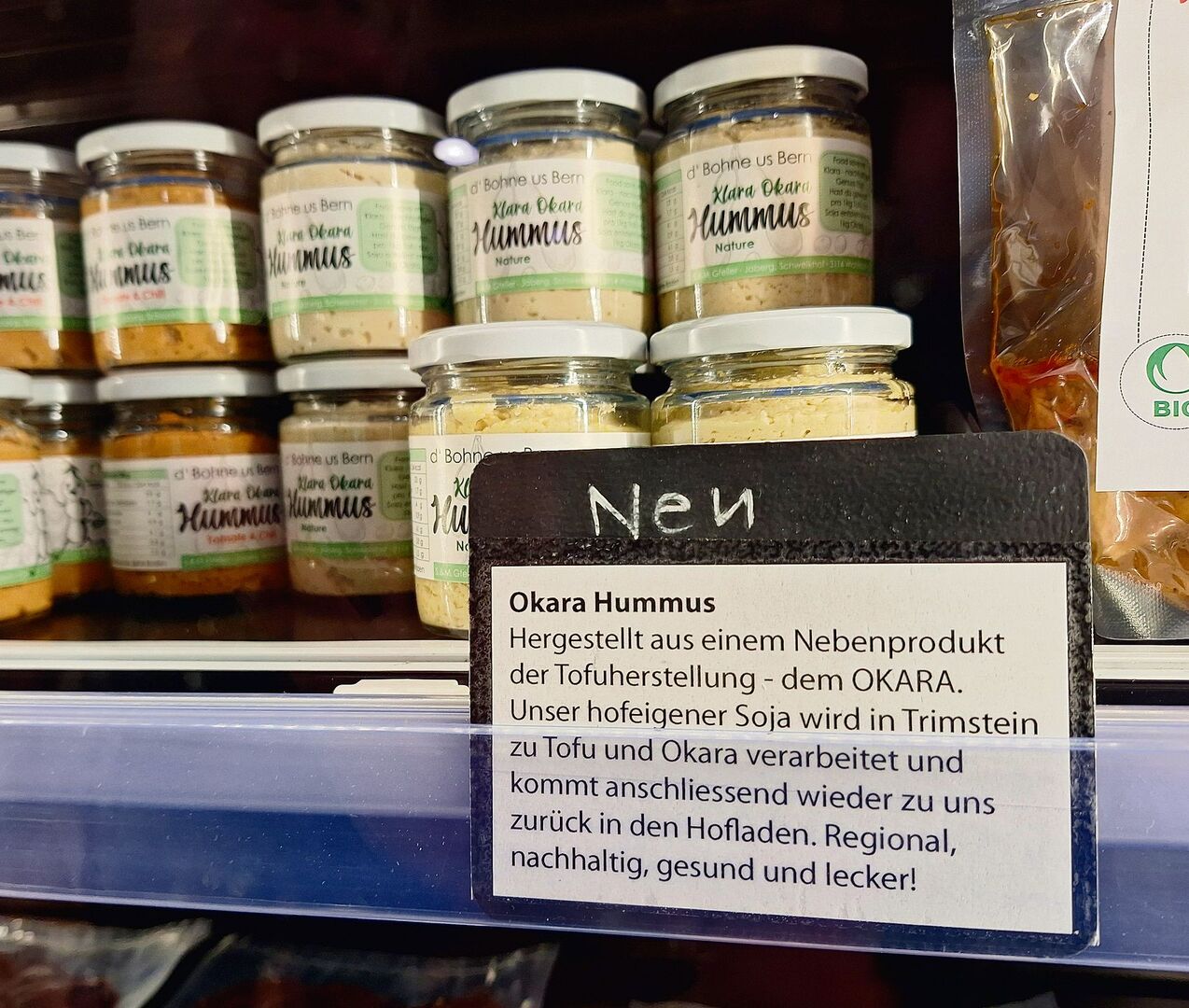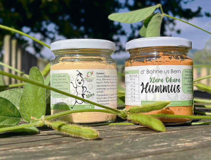 Die Anwesenden setzen sich – Most, Wasser und Kaffee wird angeboten. Auf dem Tisch befindet sich schon das Produkt, das heute im Fokus steht: der hauseigene Hummus namens «Klara Okara». Letzteres Wort gibt den entscheidenden Hinweis, weshalb genau dieser Hummus in den Augen der Emmental Versicherung, die den Agropreis ausrichtet und finanziert, als preisverdächtig gilt. Denn: Okara ist ein nährstoffreiches Nebenprodukt der Sojaproduktion.