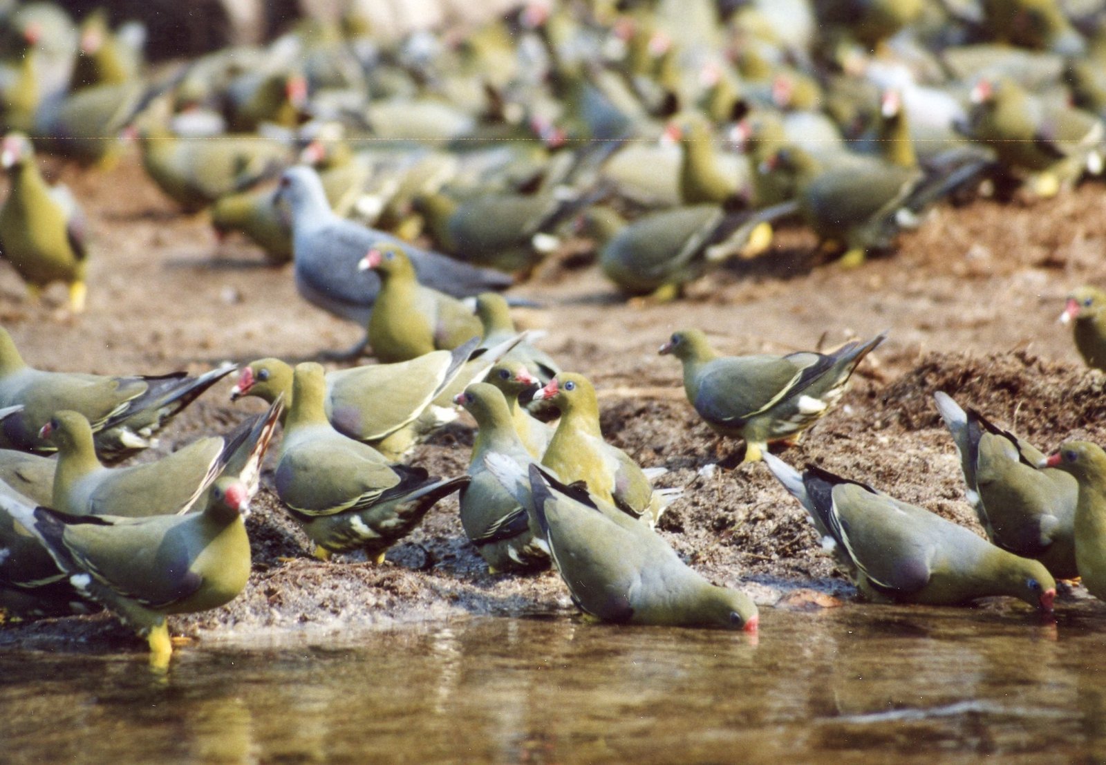 Als die Sonne längst ihre heissen Strahlen auf die sumpfige Lichtung sendet, beginnt das Taubenwunder. Plötzlich fliegen Tausende von Rotnasen-Grüntauben über die Bäume, kreisen, flattern. Die Luft ist erfüllt vom Klatschen ihrer Flügel. Sie landen entlang des seichten Wassers, trinken und picken von der mineralhaltigen Erde, als wären sie im Fieber. Wohin die Pygmäen auch blicken, überall hat es Grüntauben.
