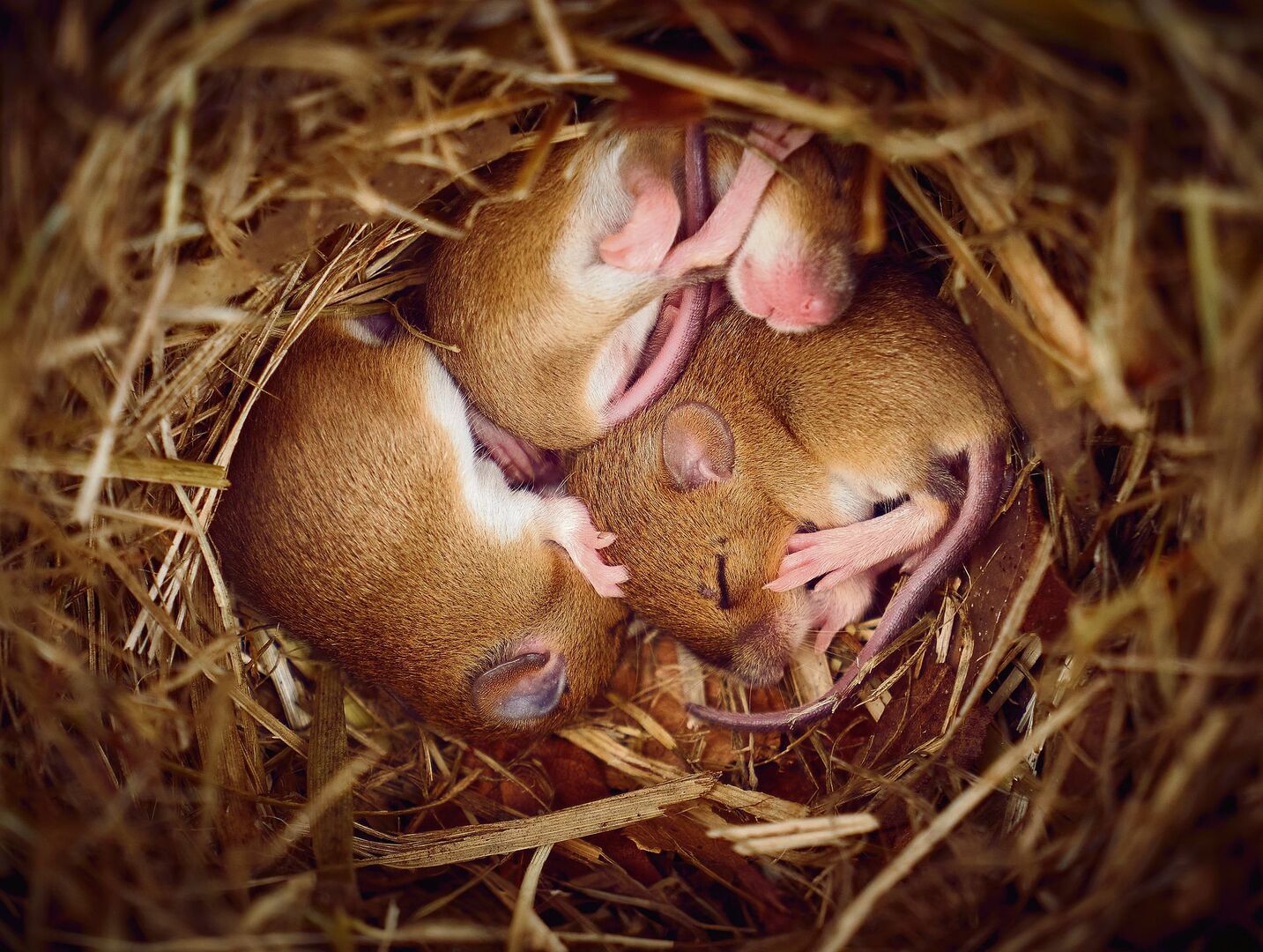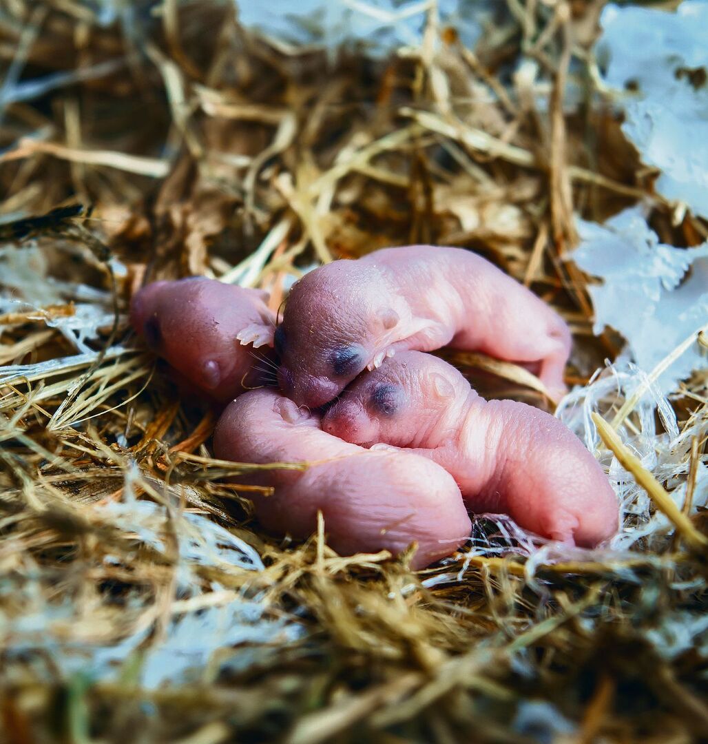 Reproduktion im AkkordHausmäuse setzen bei den Nachkommen auf Masse. Unter optimalen Bedingungen kann ein einziges Weibchen bis zu achtmal im Jahr Junge bekommen. Die Wurfgrösse variiert dabei zwischen drei und acht Jungen, die nackt, blind und taub zur Welt kommen. Bereits nach zehn Tagen sind die Jungen mit einem dunklen Flaum überzogen, nach zwei Wochen öffnen sie ihre Augen und nach drei Wochen sind die kleinen Mäuse selbstständig. Im Alter von sechs Wochen sind Weibchen geschlechtsreif und können trächtig werden. Innerhalb weniger Monate kann so aus ein paar wenigen Mäusen eine Population von hundert Tieren entstehen. Allerdings überleben nur die wenigsten Jungtiere, denn Mäuse stehen auf der Nahrungsliste von Katzen, Eulen, Greifvögeln, Wieseln, Mardern, Füchsen und Schlangen ganz oben.
