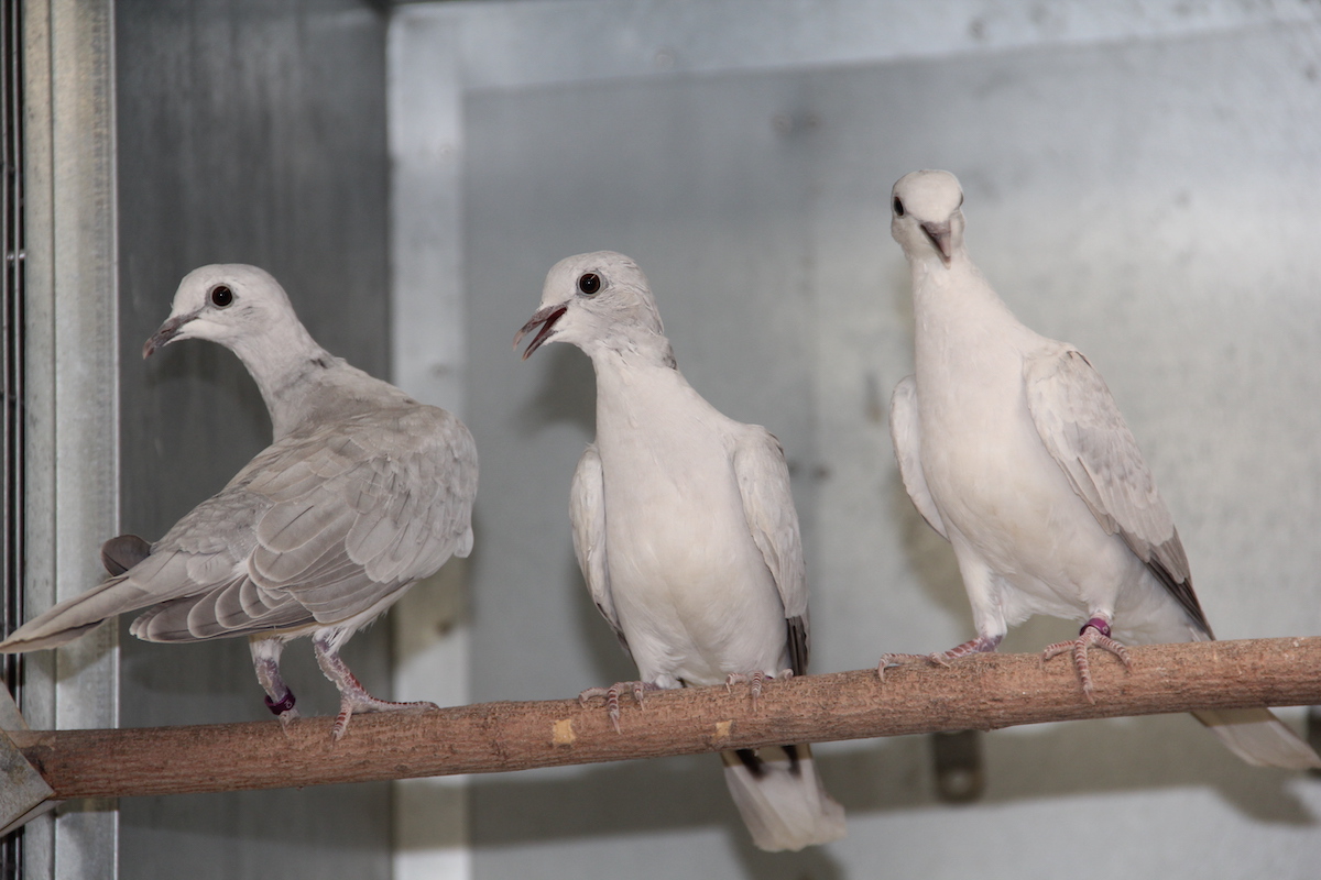 Ein Lachtaubenpaar züchtet auch in einem Käfig und zieht bereitwillig Junge auf. Als Nest sollte ein Korb zur Verfügung gestellt werden. «Es ist wichtig, dass er gross genug ist, sonst klappt es nicht.» Leutwiler verwendet halbierte Holznistkästen, in welche die Tauben ein loses Nest aus wenigen Zweigen bauen. Als Nestunterlage gibt er ihnen Heu. «Ich forme bereits eine Nestmulde vor», sagt er. Lachtauben legen immer zwei Eier, die Brutzeit dauert 18 bis 21 Tage und die Nestlingszeit 21 Tage. Drei Wochen nach dem Ausfliegen sind die Jungen selbstständig. Sie haben die Äuglein von Anfang an offen und sollten zwischen fünf und sieben Tagen beringt werden. Pierre-Alain Leutwiler lässt nicht mehr als zwei Jahresbruten zu, um die Vögel nicht zu sehr auszulaugen.