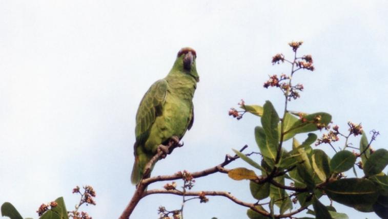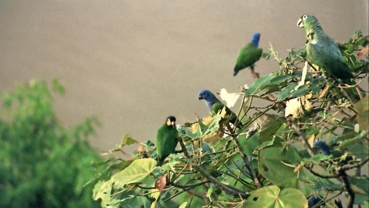 Als der Regen nachlässt und sich der graue Vorhang langsam öffnet, gibt er die Sicht auf Baumkronen preis, die zu beiden Seiten des Flusses aus dem Wasser ragen. Gellende Schreie hallen über den Strom. In einer Krone sitzt ein Schwarm Blaubartamazonen. Die grünen Papageien freuen sich über die Sonnenstrahlen, strecken ihre Flügel aus, flattern, plaudern. Als einige abfliegen, leuchtet ein scharlachroter Rumpf. Diese Amazonenart kommt entlang der Flussläufe des Varzea-Waldes vor.
