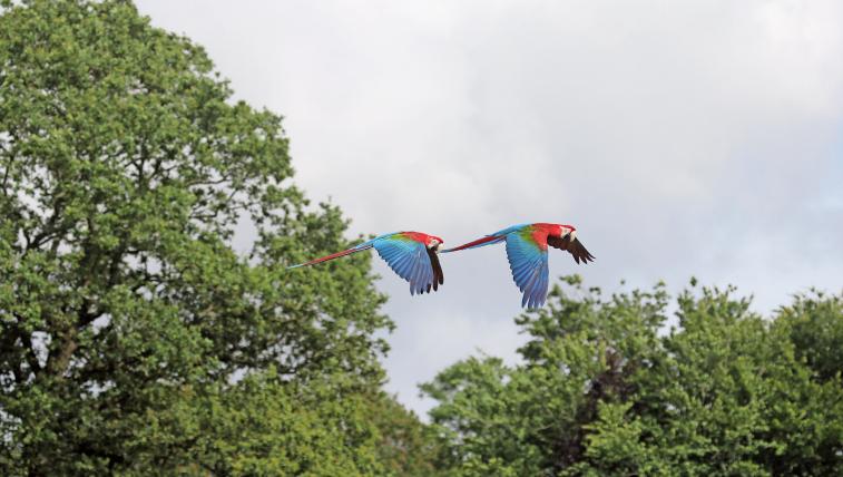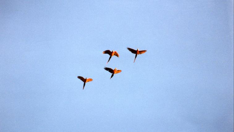Dann ist es besonders gefährdet. Die Harpie, der grösste Greifvogel des südamerikanischen Waldes, erbeutet unerfahrene Aras. Wenn alles gut geht, fliegt der Jungvogel aber ein gutes Jahr lang mit seinen Eltern über das Kronendach des Regenwaldes, vielleicht auch zur Colpa, sicher aber entlang des Tambopata-Flusses. Man weiss nämlich, dass sich Aras im Flug an Flussläufen und Überständern, also grossen Bäumen, die das Kronendach überragen, orientieren.