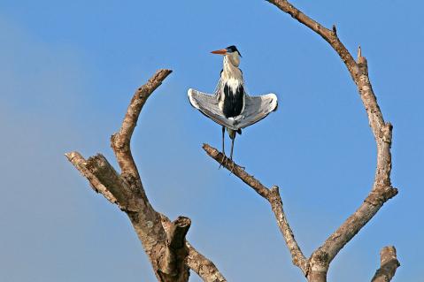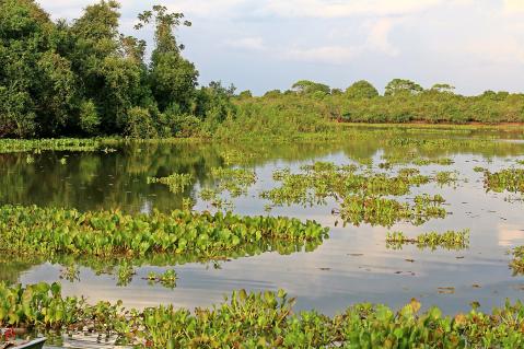 Bald schon schiebt er am Rand der Lichtung die wuchernden, dunkelgrünen Blätter eines Philodendrons beiseite und taucht mit seiner kleinen Gruppe in das Grün ein. Das Dickicht verschluckt den Trupp sofort. Düsternis, stehende, modrige Luft, Mücken surren, Spinnfäden kleben im Gesicht. Edwin stapft weiter eine Anhöhe hinauf, beidseitig nun ein dichter Bambuswald. Der jetzt trockene Boden ist voller verdorrter, vergilbter Blätter. Rascheln, keckern. Totenkopfäffchen hangeln sich durch die beweglichen Stängel. Von der Anhöhe aus fällt der Blick auf den trüben Fluss und in die Krone eines Cecropia-Baums. Das sei eine typische Pionierpflanze, erklärt Edwin. Er identifiziert das Wollknäuel im Geäst als Zweifingerfaultier.