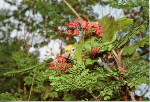 Als es einen Abhang hinuntergeht, wird die Luft wieder stickig. Plötzlich leises Grunzen, Edwin erstarrt. Unvermittelt prescht eine Rotte Pekaris davon. Die Gummistiefel sinken mit schmatzendem Geräusch im Schlamm und Schlick ein. Zu beiden Seiten wachsen Palmen, deren Stämme im Sumpf oder teilweise auch ganz im Wasser stehen. Ein rauer, kreischender Schrei erschreckt die Fremden. Ein Gelbbrustara ist in eine Palmenkrone geflogen und äugt auf die Menschengruppe herab. Im dünnen Stamm einer abgestorbenen Palme wächst sein Junges heran. Edwin bleibt stehen, klatscht sich eine Mücke aus dem Gesicht, sieht zu Boden und sagt: «Hier, frische Tapir-Spuren.»