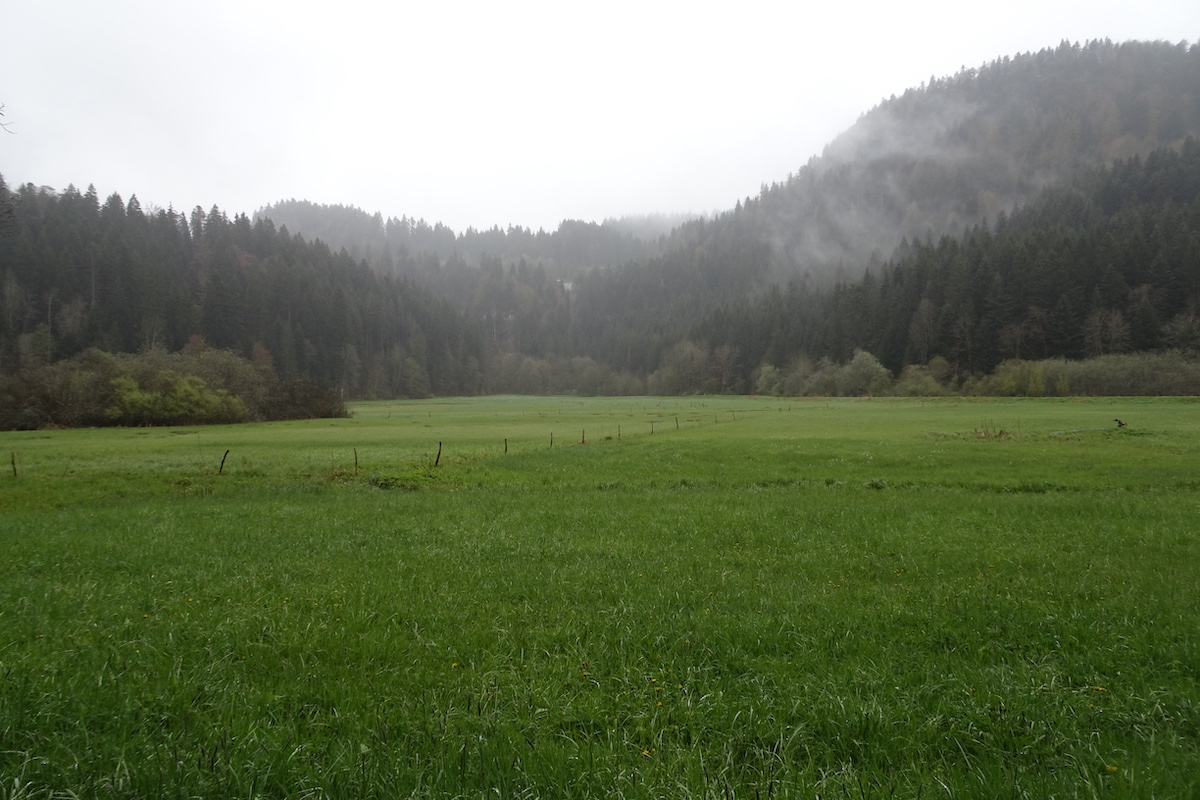 Das Flachmoor Les Goudebas hat nationale Bedeutung. Es liegt am Ende einer verträumten Schlucht. Die knorrigen Äste der Bäume sind mit dicken Moosschichten besetzt. Ein Resultat von häufigem Nebel. Auf der gegenüberliegenden Seite der Sumpfwiese liegt die Grenze zu Frankreich.