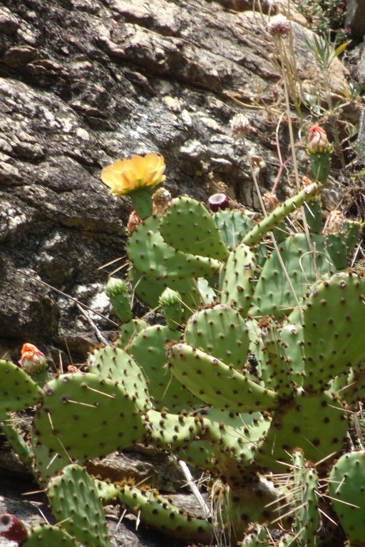 Der Niedere Feigenkakatus (Opuntia humifusa) gar überwuchert ganze Felspartien. Wie Krepppapier leuchten die gelben Blüten. Die Art zählt zu den robustesten winterharten Kakteen und soll sogar minus 30 Grad vertragen, wenn es nicht zu feucht ist. Ihr ursprüngliches Verbreitungsgebiet liegt in den östlichen und mittleren Bundesstaaten der USA.