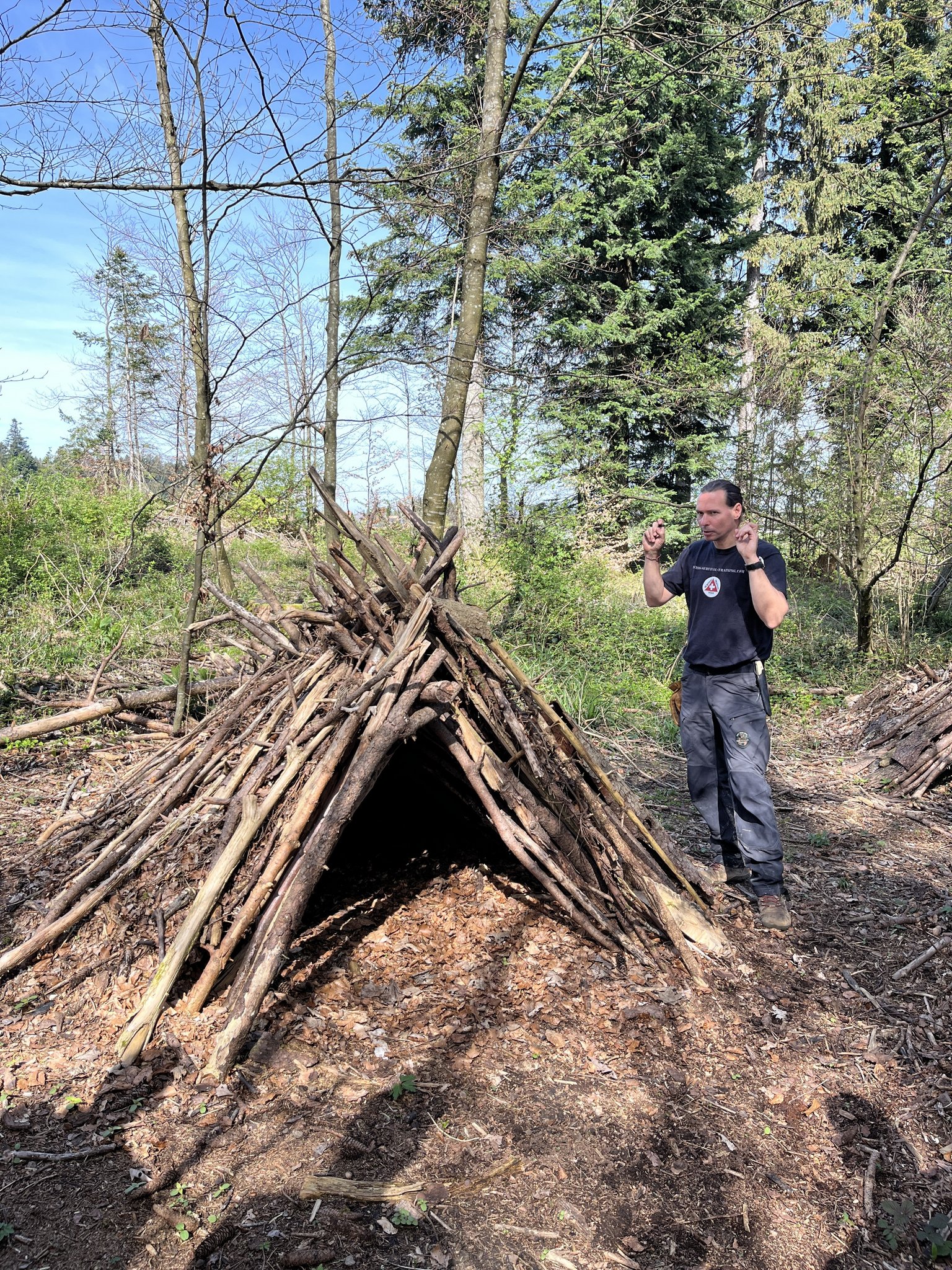 Nun geht die Gruppe in den Wald Richtung Survival-Trainingscamp von Coach Saluz. Es geht ans Eingemachte. In einer Survival-Situation müsse man sich nämlich nach einem Unterschlupf umsehen. Ist weit und breit keine schützende Höhle in Sicht, müsse man sich einen sogenannten Shelter selbst erbauen. Gion Saluz zeigt, wie dies ganz ohne Schnur oder andere Befestigungsmaterialien wie Schrauben und Nägel gelingt. Drei Äste reichen für ein stabiles Grundgerüst: Zwei dickere Äste, einer davon mit einer Astgabel, aneinander gelehnt in etwa auf Höhe des Bauchnabels, die den Eingang bilden, und ein langer, robuster Ast, der von diesen schräg nach hinten den Deckenpfosten bildet.