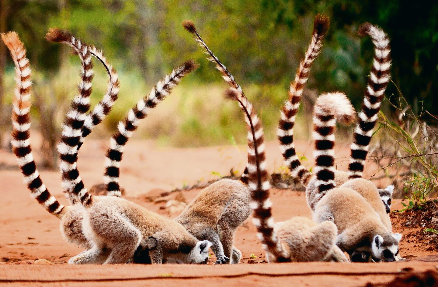 Bei den Alluaudia gedeihen zwischen den Dornen kleine, senkrecht gerichtete Blättchen. So bieten sie der Sonne die geringste Angriffsfläche. Durch den Sand wuselt ein Tanrek. Er sieht einem Igel ähnlich, hat aber nichts mit Igeln zu tun. Ganz im Gegensatz zu diesem wundersamen Trockenwald wuchern auf der Ostseite der Insel in den Regenwäldern von Ranomafana und Andasibe Palmen und der Baum der Reisenden, der viel Wasser speichert und darum so heisst.