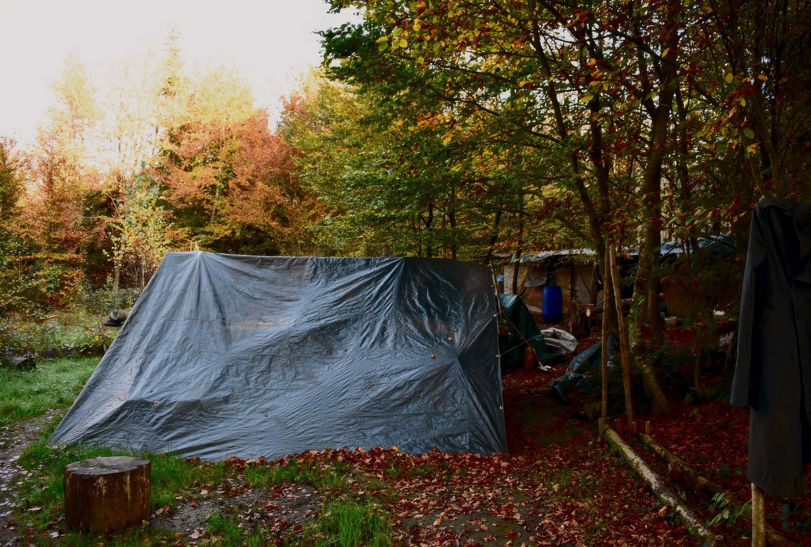 Es ist der letzte Montag im Oktober – strahlend blauer Himmel und T-Shirt-Wetter an der Sonne; der Wald herbstlich eingefärbt. Chrütli geht zielsicher durch den Wald. Immer an seiner Seite ist seine Hündin Manali. «Den Platz, wo wir jetzt leben, habe ich bereits als Kind gekannt», erzählt er. Schliesslich ist er unweit davon in Bern-West aufgewachsen. Leise Rave-Musik lässt erkennen, dass das Ziel nicht fern ist. Und tatsächlich dauert es vom Stadtrand her kaum zehn Minuten, um die Lichtung zu erreichen, auf der die Waldmenschen leben. Jeder von ihnen schläft in einem rudimentären, selbst gebauten Unterstand mit integrierter Feuerstelle; daneben ein Gemüsegarten, eine weitere Feuerstelle «für den Sommer» und ein Tisch mit einer Bank, wo Röfe bereits sitzt, Musik hört und raucht. Der 48-Jährige war vor seinem Ausstieg Bauer; hat nun seinen zweiten Winter im Wald vor sich. Chrütli gesellt sich zu ihm – doch nicht, ohne vorher einen Lungenseitling aus dem Boden zu ziehen. «Toll, das gibt ein leckeres Znacht!» Pilze zu sammeln sei für ihn wie Meditation, erzählt der 53-Jährige. «Für mich ist das die beste Auszeit des Tages, wenn ich mir einige Stunden Zeit nehme, mit den Hunden querfeldein gehe und zusehe, was ich finde.» Wenn dabei auch Abfall von anderen Waldbesuchenden ist, wird dieser genauso mitgenommen wie die Pilze. Denn: «Trage Sorge zur Natur und hinterlasse alles so, wie du es vorgefunden hast», lautet eine der wenigen Regeln, die unter den Waldmenschen gelten.
