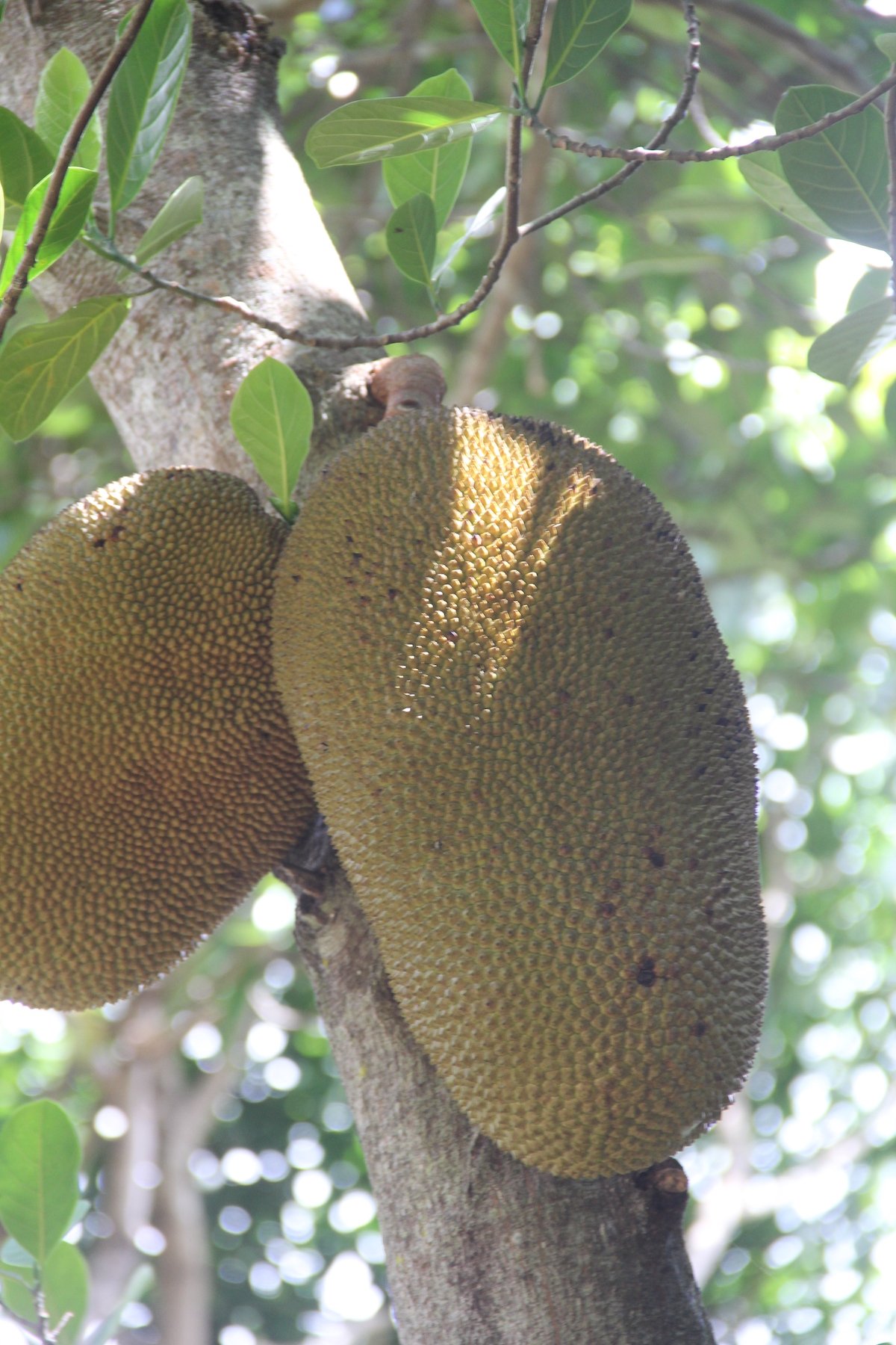 Ein weiterer aussergewöhnlicher Vertreter der Maulbeergewächse ist der Jackfruchtbaum, der ursprünglich aus Indien stammt. Er ist besonders bemerkenswert wegen den sehr grossen Früchten, die am Stamm gedeihen. Viele tropische Baumarten bilden am Stamm Blüten und Früchte aus. Das wird von Botanikerinnen als Kauliflorie bezeichnet. In der windstilleren unteren Schicht des Regenwalds gelingt die Bestäubung durch Falter besser. Das könnte eine Erklärung für kauliflorische Blüten sein. Jackfruchtbäume werden in den Tropen weltweit angebaut.